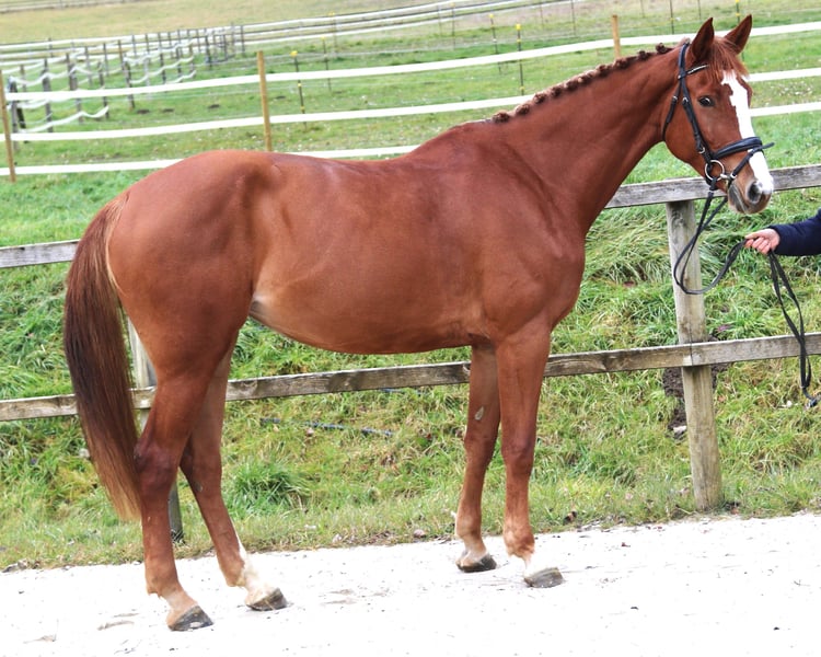 The athletic and long-legged mare Olana demonstrates a high level of quality over fences. She was initially used for breeding and was carefully introduced to sport. At six years old, she was competed up to class L by a 15-year-old rider. Although she still shows some greeness, she is well-behaved.