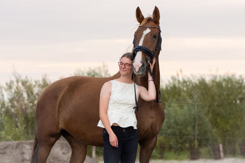 Sehr hübsche, anhängliche Stute! Schnelle Abwicklung bevorzugt (!!Der Preis ist verhandelbar, da kein fester Reiter für das Pferd vorhanden ist!! Das Pferd wird momentan nicht intensiv trainiert, sondern nur an der Longe gearbeitet.) Videos auf Anfrage! Schöne ca. 167 cm große Stute mit guten Gängen und einem kraftvollen Galopp! Nicht geeignet für einen Anfänger oder unsicheren Reiter, sie arbeitet am besten mit einem Reiter, der sie fordert. Dressur-Merrie von Idol x Fabricius aus 2017 ● Mayline (offiziell Misstopia Idol x Fabricius) ● 8 Jahre alt (2017) ● 167 cm groß (ungefähr gemessen) ● Macht sich durch ihre großzügigen Gänge und ihren wunderschönen Galopp auch in der Dressur bemerkbar! ● B/L-Niveau, 2 Turnierstarts mit guten Ergebnissen! B-Klasse, in Ausbildung L ● War bereits im Wald und am Strand, was sie brav gemeistert hat. ● Endgültig klinisch im Ende 2023 untersucht, keine Auffälligkeiten an rechts vorne bei der Schiefel, keine Einschränkungen für den Sport. ● Lieb im Stall und auf der Weide mit anderen Pferden. ● Kein typisches „Stutenverhalten“. ● Alle 6–7 Wochen beschlagen. ● Geimpft, entwurmt und kürzlich beim Tierarzt gewesen. Für May suche ich einen Reiter mit viel Gefühl, der sie mental fordert. Sie ist ein Pferd, mit dem man eine tiefe Bindung aufbauen kann, und sie möchte gerne mit dir arbeiten! Bei May sind Sattel, Ohrenkappe, Decke, Halfter und Führstrick dabei, damit sie sicher und vertraut unterwegs ist! Das Sattelzeug kann gegen einen kleinen Aufpreis übernommen werden. Preis ist verhandelbar bei schneller Entscheidung. Da ich keinen festen Reiter für das Pferd habe, wird sie momentan nicht intensiv trainiert. Weitere Infos gern im Privatgespräch.