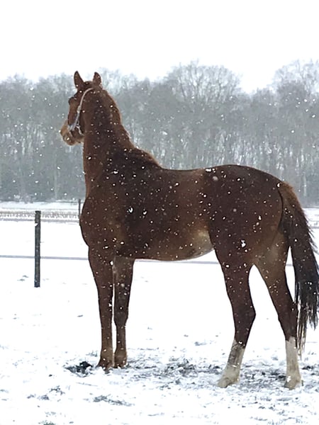 For sale: KWPN mare (2018) This stunning KWPN mare is a true gem for horse enthusiasts seeking a versatile and well-bred horse. Born in 2018, she stands an impressive 17.4 hh and exudes strength and elegance. As a chestnut mare with a striking presence, she has a well-balanced, rectangular conformation with a solid foundation. She possesses a good walk, a trot with plenty of impulsion and power, and a sufficient canter. This well-developed mare is currently ready for further training; she is saddle-trained but has not been extensively ridden. She is highly blooded and requires a clear, consistent rider. We have bred her ourselves and currently have a two-year-old colt by her, and she passes her quality on to her foal. A mare with plenty of size and quality, she has no physical limitations and can be ridden. Our recommendation is for breeding purposes due to her temperament. She is affectionate and friendly when handled but can become tense outside. If you are looking for a high-quality mare with a beautiful size, please feel free to contact us for more information or to arrange a viewing.