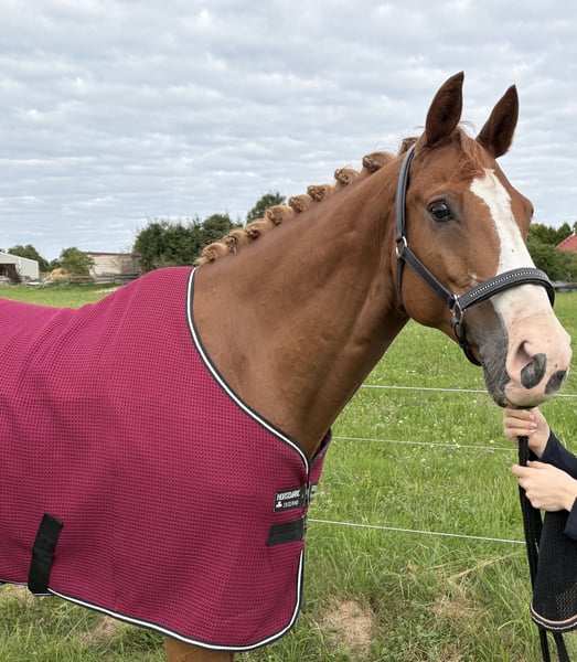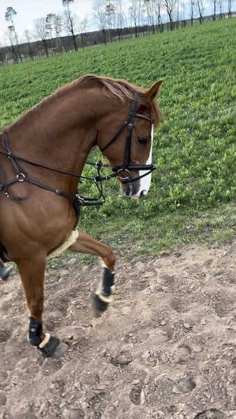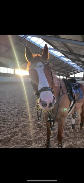 Hübscher Fuchswallach, Stm. ca 1,67/1,68. Springen 115 mit Amateur gewonnen benötigt aber sehr viel Vertrauen/Sicherheit am Sprung, Dressur/tägliche Arbeit super schön zu reiten Dressur gutes A Niveau auf dem Weg zu L. Kann Seitengänge, Rückwärtsrichten und mit Aussengalopp begonnen. Im Umgang entspannt und einfach nur zum lieb haben. Verladefromm, schmiedefromm, auch Auswärtstraining und unter Turnier Bedingungen brav. Kennt Führanlage, Galopprennbahn, ausreiten allein und in der Gruppe. Kann mit Dreieckszügeln auch von schwächeren Reitern geritten werden. Gesund, Geimpft, entwurmt und regelmäßig beim Physio vorgestellt. Preis VHB, ein nagelneuer Dressur Sattel von Prestige kann mit erworben werden. Kontakt bitte per PN oder WhatsApp