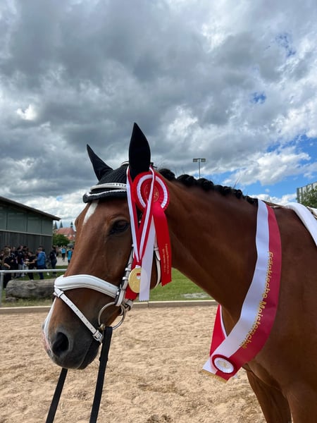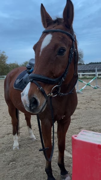 For sale is my 15-year-old KWPN gelding Felomus, known as Felo. He is approximately 165 cm tall, dark bay, and a true sweetheart in handling. Felo has a very friendly, playful nature and always displays fair behavior. He is never mean; he remains well-behaved and calm at all times. He is highly compatible with other horses and enjoys company – he can be turned out with any herd without issues. In the field, Felo is absolutely reliable, both alone and in a group. He is loading and farrier-friendly and generally handles everything you plan to do with him. Even in unusual situations, such as festive parades, he stays relaxed and composed. Sport-wise, he is placed up to L in jumping, with most of his experience in A- and E-level competitions. Over the past two years, he has not been shown at shows, as I lost interest. He needs some reassurance at the jump but is motivated and eager to learn. Dressage-wise, he is pleasant to ride and knows the common movements, making him enjoyable in this discipline as well. Felo is a versatile horse that has even gained experience in vaulting and is always willing to try new things. However, I do not wish to sell him as a vaulting horse. For someone seeking a reliable leisure partner who enjoys both trail riding and indoor riding, he is the perfect match. The sale is difficult for me, as Felo means a lot to me. Due to personal life changes, I have made the heartfelt decision to pass him into new, loving hands where he will receive the attention and support he deserves.