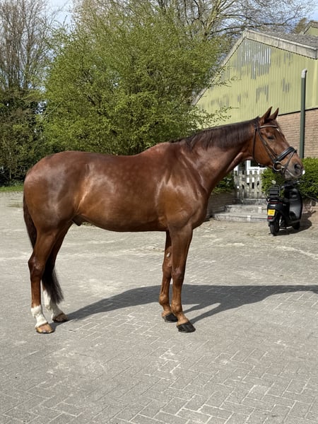 In opdracht te koop aangeboden; Figo is een 16-jarige KWPN ruin (±1.73m) die op Lichte Tour niveau is opgeleid en uitgebracht is in het ZZ-Licht. Een fijn paard met een goede basis en veel rijdbaarheid. Figo is een werkwillig en braaf paard dat altijd netjes zijn werk doet. Hij is de afgelopen jaren gereden door een amazone op leeftijd en heeft zich daarin laten zien als een betrouwbaar en meedenkend paard. Hij heeft in het verleden enkele buitenritten gelopen en liet zich daarbij braaf zien, maar heeft hier niet veel ervaring in. Zoals passend bij zijn leeftijd heeft Figo bij het losrijden even de tijd nodig om op gang te komen, waarna hij prettig te rijden is. Figo is het meest geschikt als leerpaard voor een ruiter die wil genieten van een goed opgeleid paard en wil leren van een paard dat alle oefeningen al kent, en geen ambities heeft om nog hoog in de sport te gaan rijden. Reden van verkoop is dat de huidige amazone vanwege fysieke omstandigheden moet stoppen met rijden. Voor een goed, passend huisje is de prijs bespreekbaar. Voor meer informatie of interesse graag appen naar 06-57775595