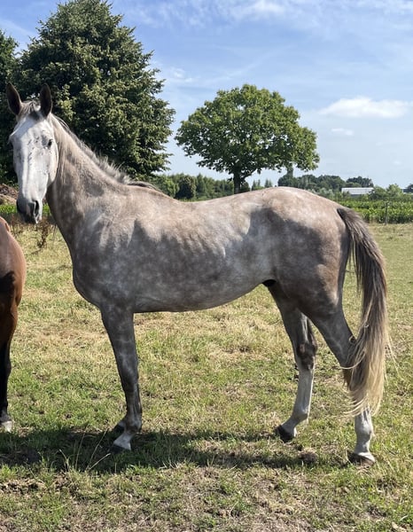3 jarige schimmel die los een mooie sprong maakt met veel vermogen.