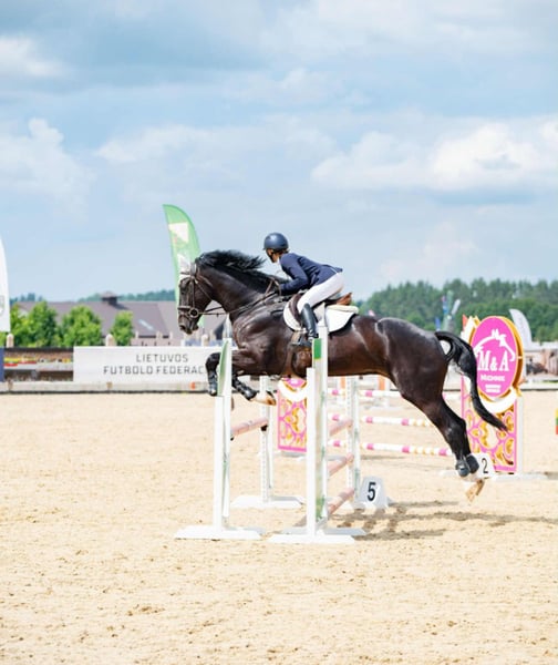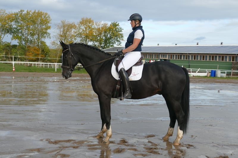 Lorant: - Charismatic black stallion of the modern riding horse type - With four white markings and a blaze - Light in movement and easy to handle - Featuring three natural gaits and experience in jumping courses - Provides a confident riding experience, even for less experienced riders