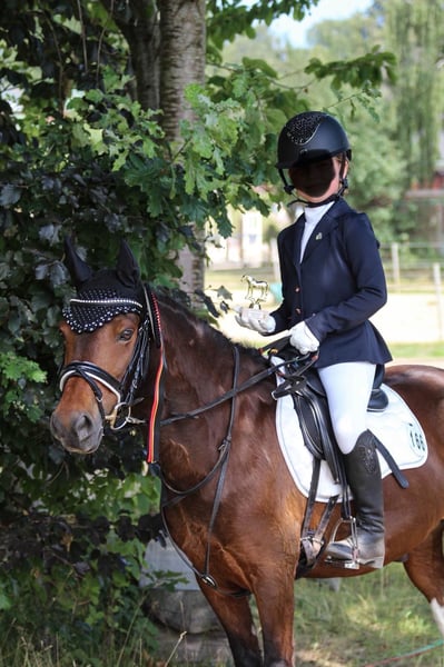 Wir verkaufen schweren Herzens unseren lieben Ponywallach Yakari • Alter: 11 Jahre • Stockmaß: ca. 1,20 m • Disziplinen: Dressur / Springen und Freizeit Yakari ist ein absolut liebenswerter und kinderfreundlicher Ponykamerad. Er wurde erfolgreich auf diversen Turnieren vorgestellt und hat dort bereits goldene Schleifen errungen. Von Führzügelklasse bis Dressur Klasse E ist er auf Turnieren vorgestellt worden. Auch das Springen macht er zu Hause brav und mit Freude mit. Für Kinder ist Yakari ein toller Partner: er lässt sich von den Kleinsten problemlos reiten, ist geduldig und ausgeglichen. Natürlich bringt er – wie es sich für ein richtiges Pony gehört – auch mal einen Dickkopf mit, was ihn nur noch charmanter macht. Er ist zudem für jeden Spaß zu haben – ob Weihnachtsreiten, kleine Zirkuslektionen mit Flatterband oder andere bunte Aktionen. • läuft barhuf • schmiede- und verladefromm • steigt problemlos in den Hänger, auch von Kindern zu verladen • bleibt überall tiefenentspannt und unerschrocken Yakari kennt sowohl Offenstall- als auch Boxenhaltung und lebt aktuell in einer großen Herde. Dort zeigt er sich grundsätzlich verträglich, kann aber auch mal temperamentvoller auftreten. So kommt es vor, dass er gegenüber Artgenossen gelegentlich ausschlägt – daher wird er auf dem Turnier sicherheitshalber mit roter Schleife vorgestellt. Für Menschen bleibt er dabei jedoch stets absolut verlässlich. Wir wünschen uns für Yakari ein liebevolles Zuhause, gerne mit Kindern, die Freude an Turnierstarts haben oder einfach einen zuverlässigen Freizeitpartner suchen. Für ein Probereiten veranschlagen wir 30€ die bei Kauf verrechnet werden.