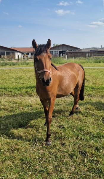 JOEY is a healthy, correctly built three-year-old gaited horse, who not only impresses with his affectionate and people-oriented nature but also shows great joy and talent in jumping, which is why we can well imagine him as a sport pony. He has grown up with us and has been started under saddle in accordance with his age. He is accustomed to children, tractors, dogs, etc., and is also good with the farrier and loading. Price will increase with further training. Sale due to downsizing of the herd.