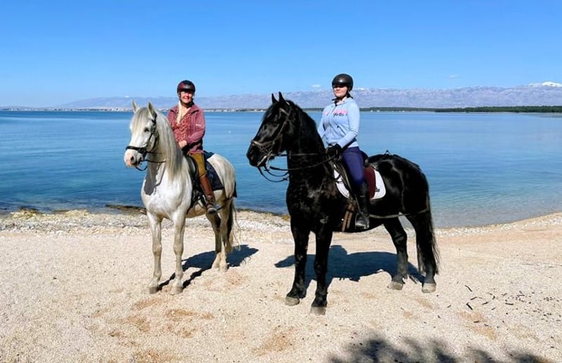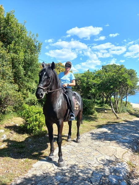 Unser Jadran ist ein 7 jähriger Wallach der Sonderklasse. Wir verkaufen ihn, weil sich herausgestellt hat dass wir in unserer Reitschule fast nur Kinder und Jugendliche haben und Jadran einfach nicht ausgelastet wird. Deshalb geben wir ihn gerne in gute Hände weiter. Jeder findet Jadran schön mit seiner glänzenden schwarzen Jacke. Er ist ein Mix aus Lipizaner und kräftigem kroatischem Warmblut. Ein echter Gewichtsträger der auch größere Reiter gut aussehen lässt. Sein Papier führt ihn als kroatisches Warmblut. Er ist ein - und zweispännig gefahren. Wenn Interesse besteht können wir ausreichend Videos zuschicken. Vor der Kutsche geht er auch im Galopp ohne Probleme und lässt sich gut wieder zügeln. Seine schöne Halsung läßt ihn leicht am Zügel stehen. Auch beim Reiten ist seine Galoppade schön bergauf und jederzeit kontrollierbar. Jadran liebt Routine und lernt schnell. Er schenkt sein Vertrauen neuen Menschen nicht gleich beim ersten Mal, aber kleinen Karottenstückchen kann er nicht widerstehen. Im Gelände geht er sowohl vor und auch hinter. Am liebsten in einer kleinen Gruppe. Jadran steht in Kroatien direkt am Meer. Im Sommer gehen wir mit ihm schwimmen. Unsere kleine Reitanlage mit 4 Pferden ist mitten in einem 5 Sterne Resort. ( Falkensteiner Punta Skala). Wenn Sie an Jadran interessiert sind könnten Sie einen Kurzurlaub im Hotel buchen und Jadran kennen lernen.