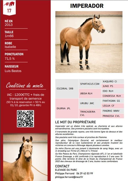 Lusitano, stallion, son of Escorial born in 2013 at Luis Bastos breed farm, scored 71.5 , Isabelle coat color.- 1.66 m, Fantastic breeding stallion, ideal for bringing in good blood, 3 excellent gaits and color. Red factor E/e Agouti A/A Cream N/Cr Pearl N/N Silver N/N Dun nd1/nd2 Champagne N/N Gray ABSENT His semen freezes very well - spermogram available on request - Semen available worldwide - he has 24 offspring registered in the Portuguese studbook and as many in Luso-Warmblood crossbreeding in France - Due to the quality of his gaits and conformation, Imperador has been approved for breeding in CDF (Cheval de Dressage Francais - French Luso-Warmblood). Lusitanien, étalon, fils d'Escorial né en 2013, à l'élevage Luis Bastos - ponctué 71.5 , de robe Isabelle.- 1,66 m, Fantastique étalon d’élevage, idéal pour apporter du bon sang, 3 excellentes allures et de la couleur Red factor E/e Agouti A/A Cream N/Cr Pearl N/N Silver N/N Dun nd1/nd2 Champagne N/N Gray ABSENT Sa semence congèle très bien - spermogramme sur demande - semence disponible pour le monde entier - il a 24 produits inscrits au studbook portugais et autant en croisement luso-warmblood en France - De par la quaité de ses allures et sa conformation, Imperador a été approuvé pour produire en CDF (Cheval de Dressage Francais - French Luso-warmblood)
