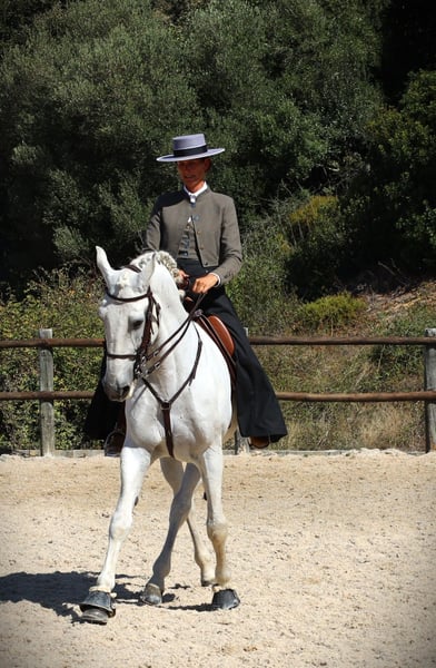 Nuestro hezaire es simplemente un caballo perfecto. Además de haber participado en concursos y haber ganado en campeonatos de Lusitano, ha sido un maestro de escuela que pacientemente ha enseñado los fundamentos de la doma a jinetes de todo el mundo. Antes de esto, trabajó como semental de reproducción (produce potros de color, incluyendo algunos rappen, ver ascendencia sobre Pagode/Trinco), y ha estado en ferias, incluyendo este año en Golegã. Es un caballo seguro en el campo, completamente insensible a los estrogones, ya que es un animal muy confiado y seguro, sin llegar a ser aburrido. No puedo imaginar un mejor caballo versátil. Lo vendemos con mucho pesar, ya que hemos dejado nuestro programa de enseñanza de doma por motivos de edad, y él ahora está prácticamente sin trabajo. Como está en excelente forma, completamente sano y nunca ha tenido problemas de salud, seguramente podrá enseñar mucho a una persona especial. Nos reservamos el derecho de escoger a su nuevo dueño y, en caso de que no encaje, también de decir que no.