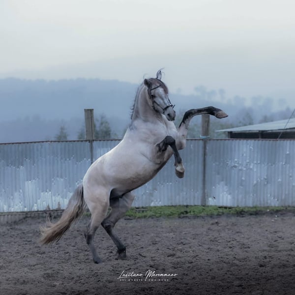 Young Lusitano stallion in a rare gray-dapple-shimmel coat, gentle, well-behaved, and talented! Features: - Breed: Lusitano - Gender: Stallion - Year of Birth: 2022 - Color: Gray-dapple-shimmel - Height: approximately 15.2 hh Description The three-year-old Lusitano stallion São Paio is now available for sale. He impresses with his exceptionally beautiful gray-dapple-shimmel color and his very sweet and human-oriented nature. He currently measures about 15.2 hh but will undoubtedly grow a little more. Training São Paio is currently in age-appropriate, gentle training. He is lunged, works calmly on the longe line, and has already been worked in all basic gaits under saddle. He accepts rider weight very well and consistently shows attentiveness, cooperation, and sensitivity to aids. His training will of course continue in a humane and patient manner, allowing him to develop positively. Movement & Potential Even in free movement, São Paio demonstrates good self-carriage, excellent basic gaits, and great talent for Working Equitation. His presence is elegant, always balanced, and pleasant to handle. Lineage São Paio comes from a remarkable pedigree – his grandsire is none other than the famous Escorial, which is clearly reflected in his quality, movement, and expression. Summary A young Lusitano with lots of charm, talent, and a special color, who will surely bring his future owner great joy—whether as a leisure partner, Working Equitation horse, or a future riding horse with potential. Additional photos and videos can be provided upon request.