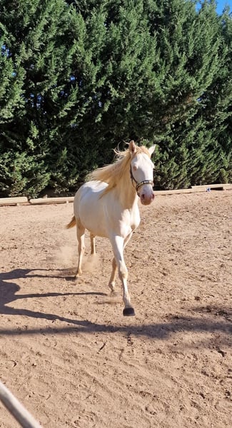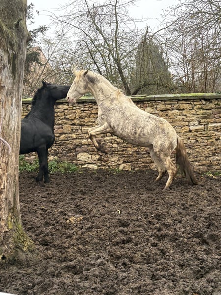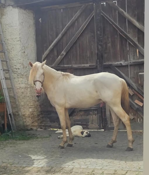 Ecco a voi Louis, registrato come Rexadorex Rex Regulus. E la sua regalità è davvero evidente. Non solo per il suo colore dorato, gli occhi azzurri ghiaccio e la sua postura elegante, ma anche nel suo comportamento. Louis è estremamente affettuoso e desideroso di lavorare, ma non è una palla di sonno. Ha carattere e fuoco, e mostra il suo impegno nel lavoro solo quando si fida del suo cavaliere. Altrimenti può diventare nervoso e preferisce decidere da sé cosa gli sembra giusto in quel momento. L'ho acquistato da puledro e nel corso degli anni sono riuscito a conquistare la sua fiducia, così ora attraversa tranquillamente qualsiasi traffico stradale, viadotti, tunnel e conosce macchinari di ogni dimensione. In addestramento ha bisogno di calma e coerenza; allora affronta qualsiasi sfida con il suo cavaliere. Dopo un grave incidente di escursionismo, la mia mobilità è limitata e non posso essere io a occuparmi di lui a lungo termine, poiché il lavoro a terra da solo gli annoia. È stato addestrato secondo i principi della scuola classica di equitazione accademica, conosce i segnali del cavaliere anche da terra e adora questo tipo di lavoro. Sa eseguire la reinclinazione delle spalle e le manovre di posteriore. Conosce anche il bridon, il cappio e la sella. Tutto ciò non rappresenta alcun problema per lui e aspetta con entusiasmo il prossimo passo nel suo addestramento. Si trova con noi in un branco misto con il mio stallone Friesian e tre gelding; è molto giocoso, ma non rozzo e non è stallone. Si comporta bene passando accanto ad altri cavalli, anche alle femmine. I suoi denti sono regolarmente controllati, così come le vaccinazioni, i trattamenti antiparassitari e le visite dal maniscalco. I suoi zoccoli sono nudi e sono giudicati ottimi dal ferratore. Ora aspetta la sua persona speciale, con la chiave giusta per un re 🙂