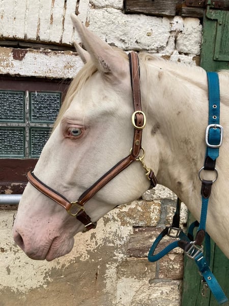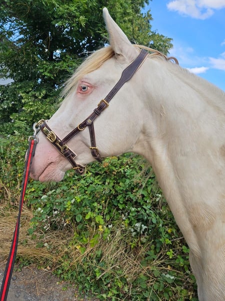 Allow me to introduce Louis, registered as Rexadorex Rex Regulus. And indeed, he is truly regal. Not only because of his shimmering golden coat, icy blue eyes, and graceful posture, but also in his behavior. Louis is very affectionate and eager to work, though he’s no couch potato. He has plenty of temperament and fire, and he only shows his enthusiasm for work when he trusts his handler. Otherwise, he can become quickly nervous and prefers to decide for himself what feels right in the moment. I purchased him as a foal and have spent years earning his trust, so he now confidently navigates busy traffic, viaducts, tunnels, and is familiar with machinery of all sizes. He needs calmness and consistency in training, then he will go through fire for his person. Due to a serious riding accident of my own, my mobility is limited, and I am no longer able to be his permanent handler, as ground work alone is too boring for him. He has been trained in classical academic riding from the ground, knows the rider’s aids from ground work, and enjoys this type of work very much. He is proficient in shoulder-in and shoulder-out, as well as hindquarter yield. He is familiar with the bridle, bitless bridle, and saddle. All of this is no problem for him, and he is eagerly awaiting the next step in his training. He is kept in a mixed herd with our Friesian stallion and three geldings. He is very playful but not rough, and not at all stallion-like. He calmly passes by other horses, including mares. His teeth are regularly checked, and he is vaccinated, dewormed, and presented to the farrier regularly. His hooves are barefoot and in excellent condition, according to the farrier. Now he is waiting for his special person, with the right key to a king’s heart. 🙂