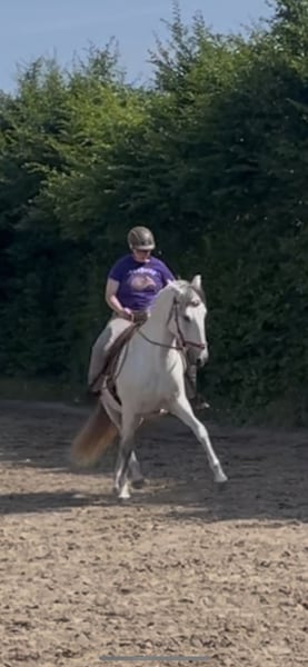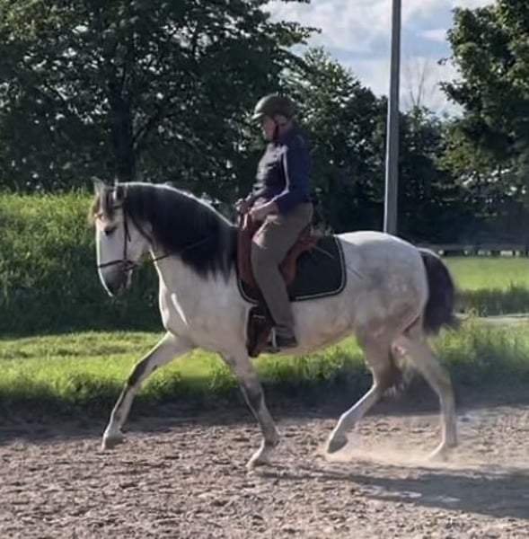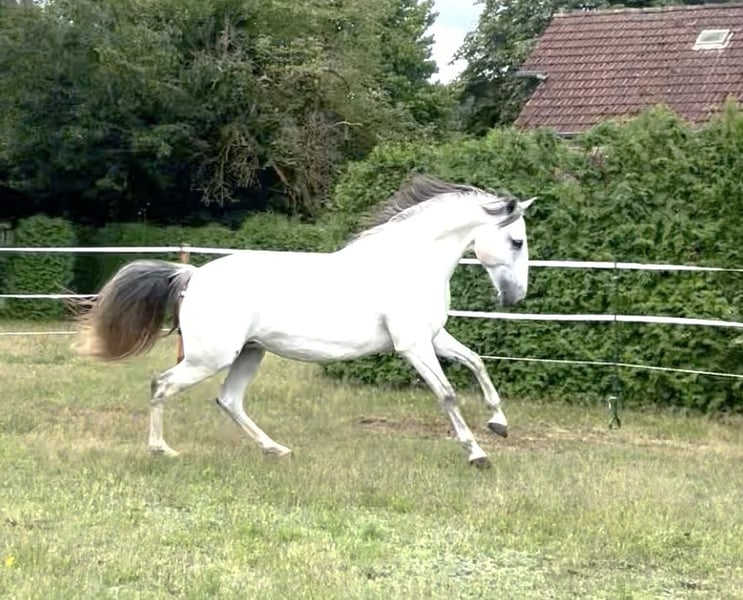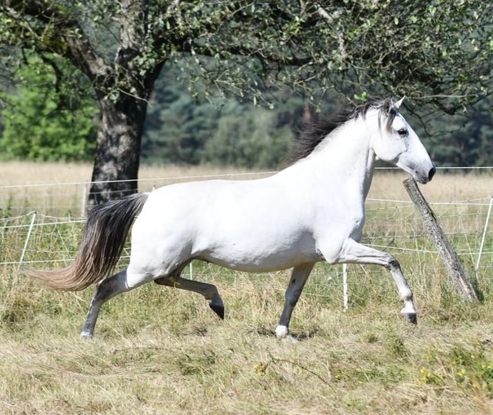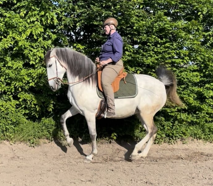 Extrem typvolle , sehr barocke Lusitanostute mit viel Gurtentiefe und herausragenden schwungvollen großen Bewegungen, die einen vergessen lassen, dass sie nur 1,59 Stockmass hat. Sie ist sehr stolz und charakterstark mit sehr viel Power ohne aber zappelig zu sein. Da mir aus Altersgründen auf Dauer diese Energie zu viel sein wird ( Frau wird nicht jünger) suche ich jetzt eine jüngere Reiter/in , die Spass daran hat, diese Energie für sich zu entwickeln. Li ist nach klassischen Grundsätzen solide ausgebildet, beherrscht alle Seitengänge in Schritt und Trab, piaffiert und passagiert, der Galopp hingegen ist noch nicht so weit ausgebaut. Sie lebt im Offenstall, ihr Sozialverhalten ist tadellos, da sie aber rangniedrig ist, könnte ich mir auch vorstellen, dass sie mit einer Paddockbox und ganztägigem Auslauf zufrieden ist.