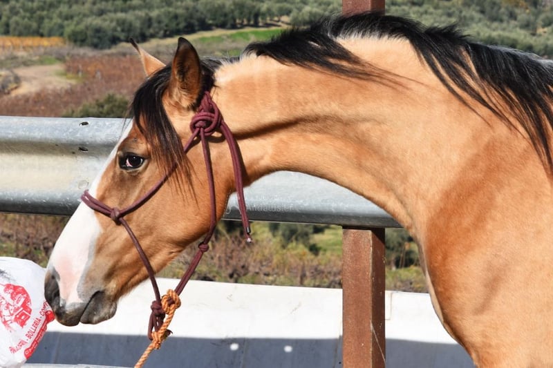 Caractère doux, un peu sauvage, en pâture avec d'autres juments, de petite taille, couleur particulière, bons mouvements. www.elegante-andalusier.com