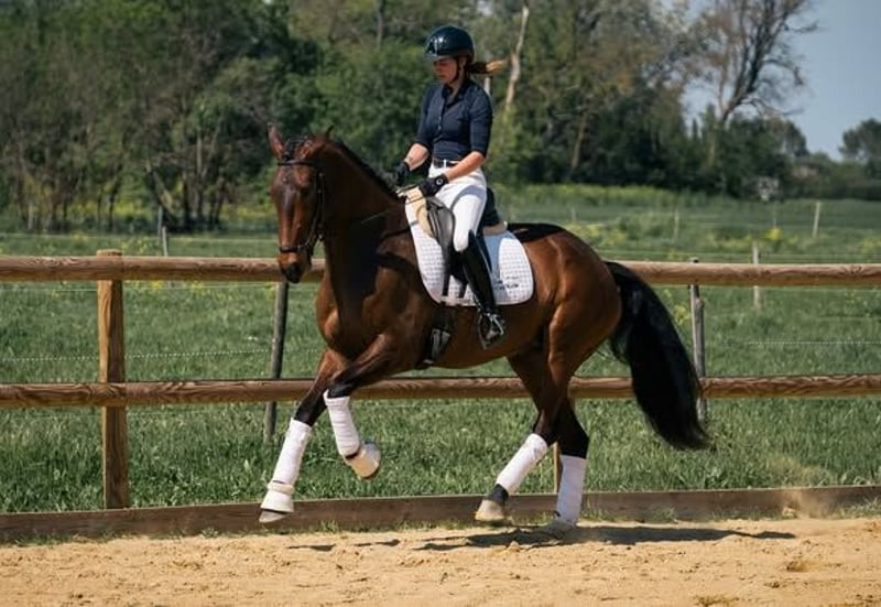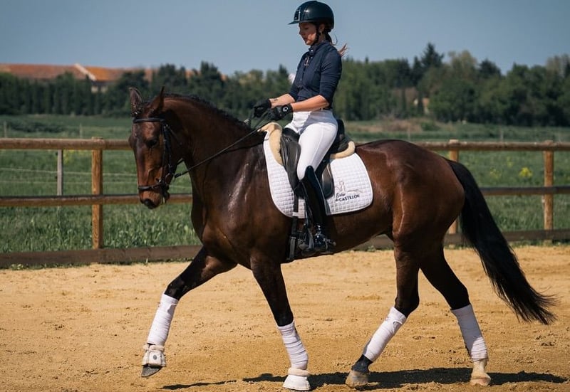 We present to you Pimenta, an elegant 6-year-old Lusitanian x KWPN cross mare, ideal for a rider seeking an energetic, powerful, and easy-to-handle horse in daily life. Sire: Wespoint S – Coming from renowned bloodlines known for their exceptional gaits and aptitude for dressage, he passes on to his offspring balance, energy, and a beautiful scope. Dam: Janota, of Lusitanian origin, brings suppleness, intelligence, and a calm mindset, highly valued for her versatility under saddle. This combination of Wespoint S, a representative of the KWPN studbook’s excellence, and Janota, a Lusitanian mare with functional roots, results in a modern mare that combines expressiveness, strength, and generosity. Pimenta has a harmonious build, standing at an ideal height of 16.1 hh. She was backed at three years old and has benefited from careful groundwork from an early age, respecting her rhythm and mental state. Easy and pleasant on the ground, she is gentle, respectful, and manageable in all circumstances. Under saddle, she reveals genuine energy and a generous engine. This is a spirited mare, without vices, always willing, offering a beautiful, expressive, powerful, and balanced canter. She has been taken out several times alone or in groups without any issues. Although she has not yet competed, she already possesses a good level of work: - Shoulder-in - Leg-yields - Halt-to-halt transitions - Counter-canter Recent radiographs (hooves, fetlocks, and stifles) are available for consultation. She is also easy to transport, up to date on vaccinations and deworming, and was seen by the dentist last year. With her respectful temperament, natural strength, healthy energy, and solid technical level, Pimenta would be perfectly suited for a rider looking to develop in dressage with a well-mounted mare, ready to perform and progress confidently in training.