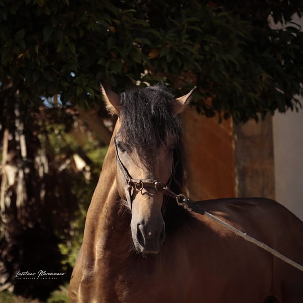 Lusitano in special color – 1.70 m – A real eye-catcher with a gentle nature Features: - Breed: Lusitano - Gender: Gelding - Year of Birth: 2022 - Color: Buckskin - Height: 170 cm This extraordinary three-year-old Lusitano gelding captivates not only with his rare special color (Buckskin) but especially with his impressive height of 1.70 m, making him a true standout – whether in the arena, on the trails, or perhaps even at a few competitions in the future. He displays a very calm, people-oriented, and balanced character. Currently, he is being calmly introduced to lunging – with plenty of time and patience for healthy development. With his charming nature and appearance, he has everything it takes to become a loyal leisure partner in the future – whether for relaxed rides, working equitation, or perhaps as a highlight at a small competition or shows. An exceptional horse for those seeking something special. I can gladly provide more pictures and videos upon request.
