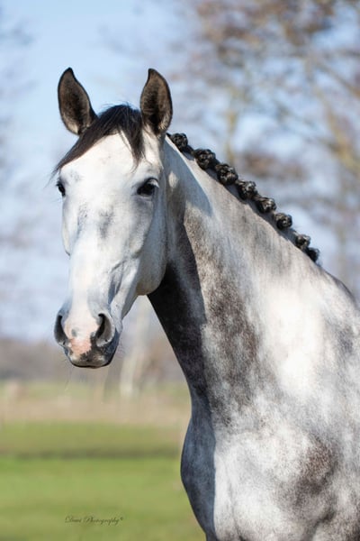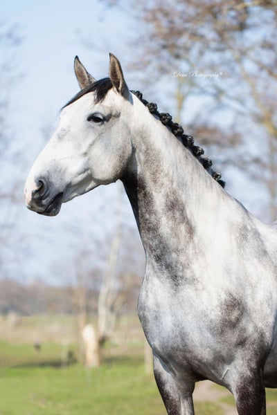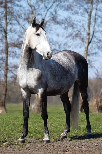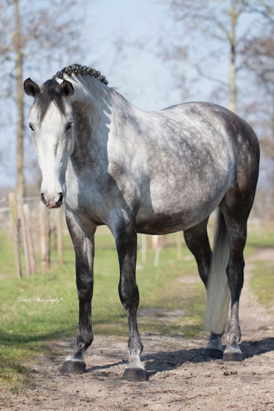 Zum Verkauf angeboten: 6-jähriger (geboren am 16. April 2020) PSL-Schimmel-Wallach. Stockmaß ca. 1,67 m. Abstammung: Epico das Figueiras x Renovado. Quieto ist ein äußerst liebenswerter und menschenbezogener Fröhlicher. Er freut sich immer, dich zu sehen, und arbeitet gerne mit und für dich. Er hat Charakter und ist definitiv kein „Langweiler“. Aufgrund bestimmter Umstände hat er eine Zeit lang nicht unter dem Sattel gestanden, wurde aber vom Boden aus gearbeitet. Er kennt Longieren in Einfach- und Doppel- sowie Arbeiten an der Hand. Das Reiten wird nun langsam wieder aufgenommen. Er ist sehr fleißig im Training und zeigt echtes Potenzial. Er tritt von Natur aus weit über, hat einen schönen Trab und eine großzügige Galoppade. Das Seitwärtsgehen an der Schulter und die Schenkelweichen sind ebenfalls kein Problem. Quieto kommt gut mit anderen Pferden aus. Momentan steht er mit einem Kumpel auf der Paddock, im Sommer in der Gruppe mit Wallachen auf der Weide. Er ist nicht unbedingt dominant, zeigt aber deutlich, was er von etwas hält. 24/7 draußen zu stehen, stellt kein Problem dar. Wir haben ihn 2024 selbst aus Portugal importiert. Er wurde dort gründlich klinisch und röntgendiagnostisch (gut) untersucht (Bericht vorhanden). Er war dort im Grundausbildung, wurde aber aufgrund eines Umzugs und der damit verbundenen Umstände sehr ruhig behandelt und die Zeit gegeben, sich zu akklimatisieren. Er hat von Natur aus starke, harte Hufe und steht daher ohne Eisen.