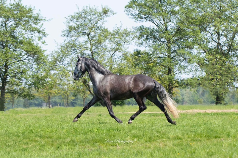 Te koop aangeboden: 6-jarige (16 april 2020) PSL schimmel ruin. Stokmaat ca. 1.67m. Afstamming Epico das Figueiras x Renovado. Quieto is een ontzettend lieve en mensgerichte vrolijkerd. Altijd blij je te zien en werkt graag met en voor je. Heeft wel karakter en is absoluut geen ‘dooie’. Heeft door omstandigheden enige tijd niet onder het zadel gelopen, wel vanaf de grond gewerkt. Kent hierbij longeren enkel en dubbel, ook werken aan de hand. Rijden wordt nu weer langzaam opgepakt. Is heel ijverig in het werk en heeft echt potentie. Stapt van nature ruim over, heeft een mooie draf en ruime galop. Pasje wijken en schouder voor is ook geen probleem. Quieto kan goed met andere paarden. Staat nu met een maatje op de paddock, in de zomer in de ruinengroep in de wei. Is niet per se dominant, maar laat wel zien wat hij ergens van vindt. 24/7 buiten geen probleem. We hebben hem in 2024 zelf uit Portugal geïmporteerd. Is daar uitgebreid klinisch en röntgenologisch (goed) gekeurd (rapport aanwezig). Was daar basis gereden, maar door verhuizing en de gevolgen daarvan heel rustig aan gedaan en hem de tijd gegeven te landen. Heeft van nature sterke, harde hoeven, staat dan ook zonder ijzers.