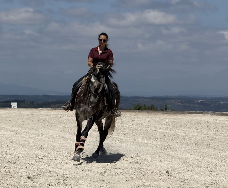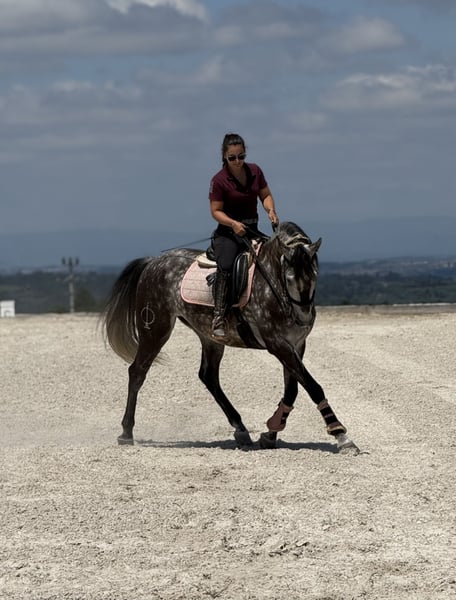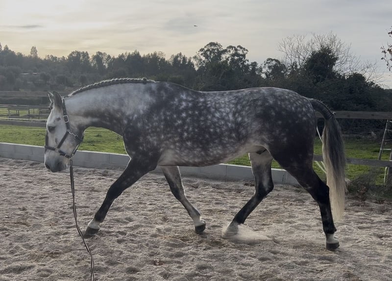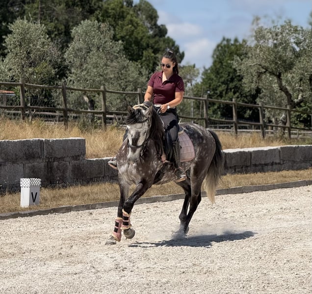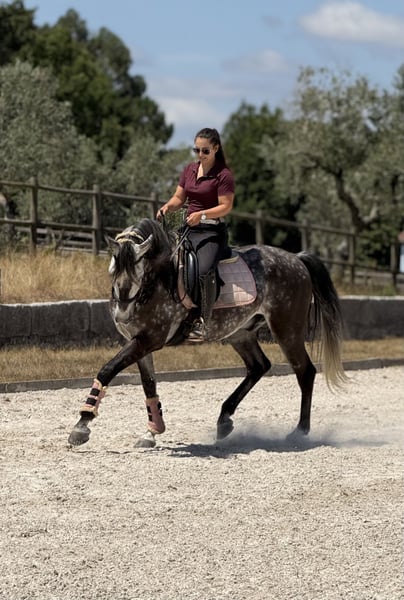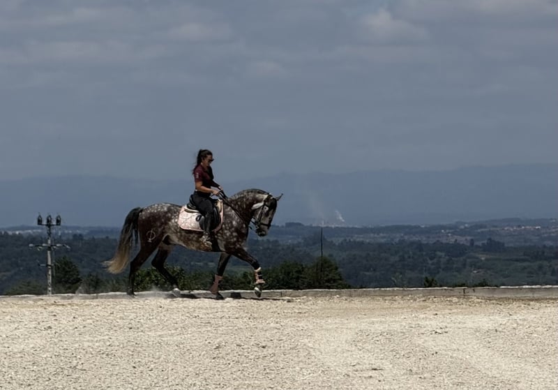 An exceptionally beautiful 6-year-old grey Lusitano gelding standing at 1.62m (approximately 16 hands) at the withers, with a sweet temperament and excellent manners. He is easy to handle in all aspects of daily care — respectful, calm, and reliable — making him a true pleasure to be around. While he is not suitable for complete beginners, he is a horse that an amateur rider, especially with the support of a trainer, can thoroughly enjoy and progress with. This gelding is in excellent health, tested negative for piroplasmosis, and has X-rays available. He is fully up to date with vaccinations, dental care, deworming, and shoeing, ensuring that he is ready to continue his training and development without interruption. Under saddle, he is well established in all three gaits and currently learning the tempi changes, canter pirouettes and passage. He performs walk–canter transitions, walk pirouettes, leg yields, shoulder-in, travers, rein-back, half-passes and flying changes with ease. From the ground, he is beginning to show the first steps of piaffe and Spanish walk, demonstrating both willingness and aptitude for classical work. He has already participated in his first dressage competition at elementary level, scoring nearly 68% — a very promising result for a debut. With his naturally balanced and comfortable canter, he would also be an excellent candidate for working equitation, showing great potential for both the dressage and maneuverability phases. Outdoors, he is equally reliable. This horse is brave and confident on trail rides, unfazed by his surroundings, and particularly enjoys leading. He is very comfortable going out alone and remains calm and steady throughout. He is located in Serra da Estrela, Portugal, and is available for visits and trial rides without any problem. More videos and additional photos are available upon request — feel free to contact us for more information Price negotiable for the right home.
