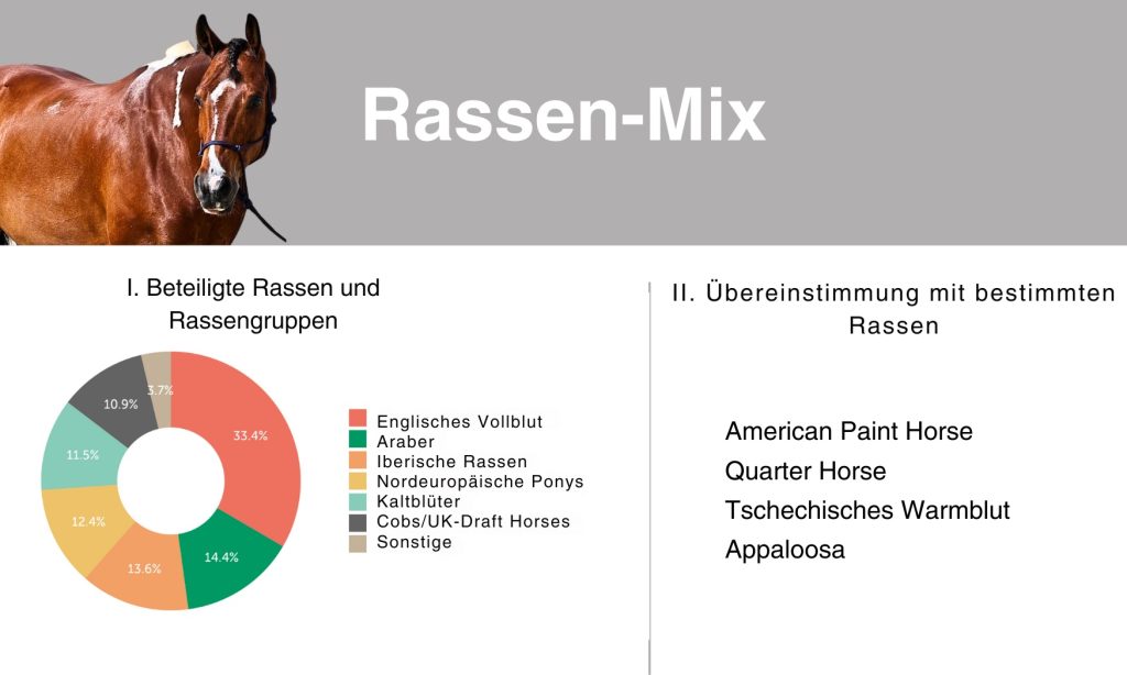 - Der zweite Teil gibt Auskunft darüber, bei welchen vier Rassen dein Pferd die größten genetischen Übereinstimmungen mit anderen Pferden der Rasse aufweist. Anders als bei vielen Hunderassen sind die Zuchtbücher bei Pferden meist offen oder teiloffen. Dadurch sind gezielte Einkreuzungen anderer Rassen zur Verbesserung von Exterieur, Leistungsfähigkeit oder Interieur üblich. Aus diesem Grund ist es möglich, dass im Ergebnis auch bei Pferden mit Abstammungsnachweis abweichende Rassen aufgeführt werden.