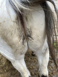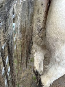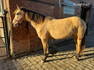 Winnie ist ein 8-jähriges polnisches Warmblut, das von Beginn an unter starkem Kotwasser litt. Die Hinterbeine waren teilweise so stark verklebt, dass sie selbst mit Waschen kaum sauber zu bekommen waren.