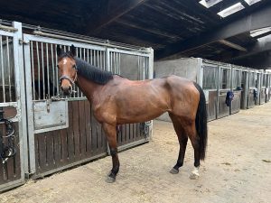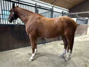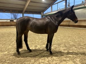 Als zweites Pferd habe ich eine junge Stute gewählt, die ihren ersten Winter als Reitpferd verbringt. Bereits zuvor zeigte sie sich bei neuen Situationen oft hektisch und reagierte bei Auswärtstrainings oder Turnieren mit wässrigem Kot und Futterverweigerung. Auch hier wollte ich prophylaktisch unterstützen, insbesondere im Hinblick auf die Haltungsumstellung.