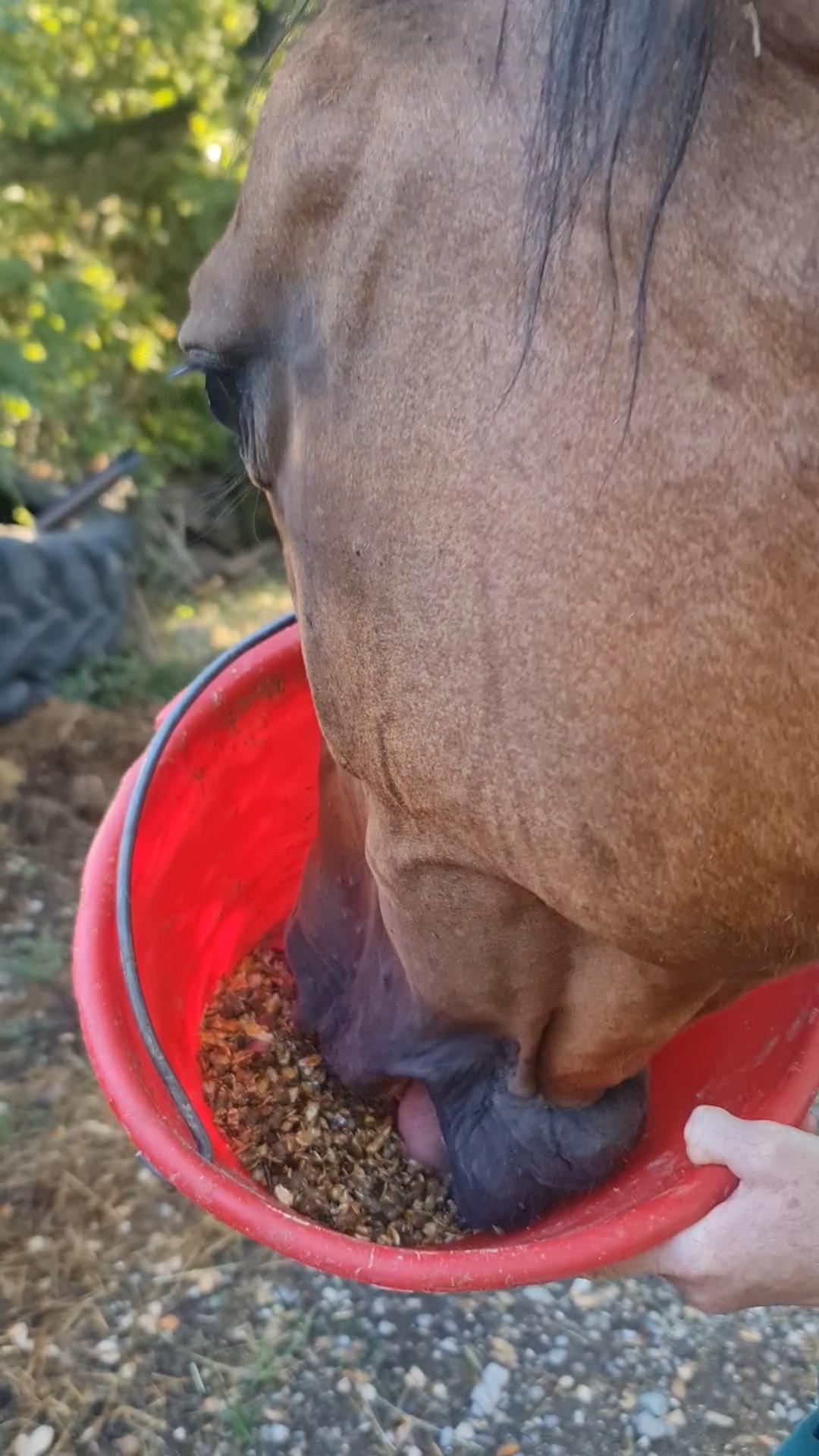 Nachdem das Paket pünktlich bei uns ankam, ging es sofort los. Das Müsli hat eine tolle Struktur, die auch für meinen älteren Westfalen-Wallach geeignet ist. Besonders auffällig war der angenehme Geruch nach Kräutern, Luzerne und Frische.