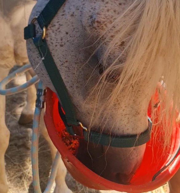 Der letzte Testkandidat war ein 22-jähriger PRE, der aus reiner Boxenhaltung kam und unter starken Magengeschwüren litt. Nach Behandlung und kontinuierlicher Heugabe half ihm das deukavallo, sein Futter besser zu kauen und einzuspeicheln. So blieb er vor Rückfällen geschützt und konnte sein Gewicht besser halten.