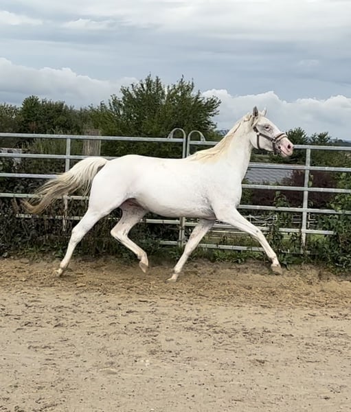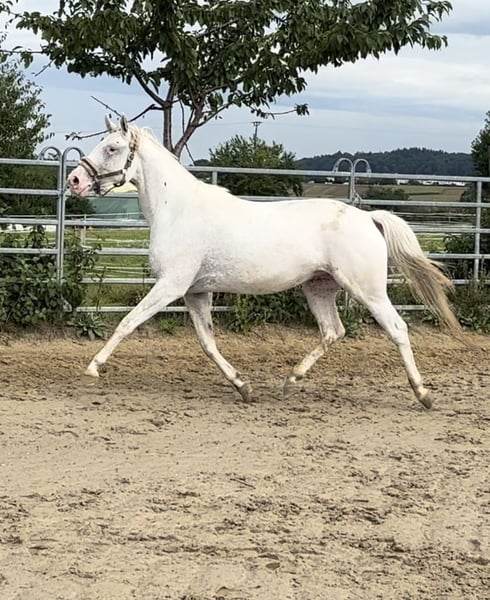Homozygous white-born tiger-spotted mare. LP/LP, Patn1/Patn1, A/A, E/e, D/nd2. She is in foal to Lord Europe for 2026. From this pairing, only a brown tiger or a brown tabby tiger can be expected. Well-behaved and uncomplicated in handling, well lunged, not yet ridden. She is eligible for breeding in Germany (Stutbuch 1), and her offspring can also be registered with Kwpn Reg. A. The pedigree of the foal is visible on the documentation. Calm with the farrier and relaxed during transport.