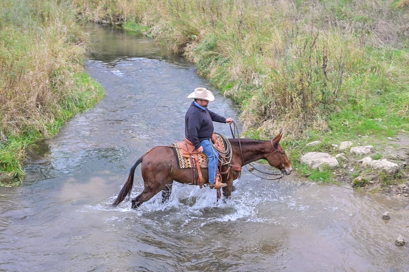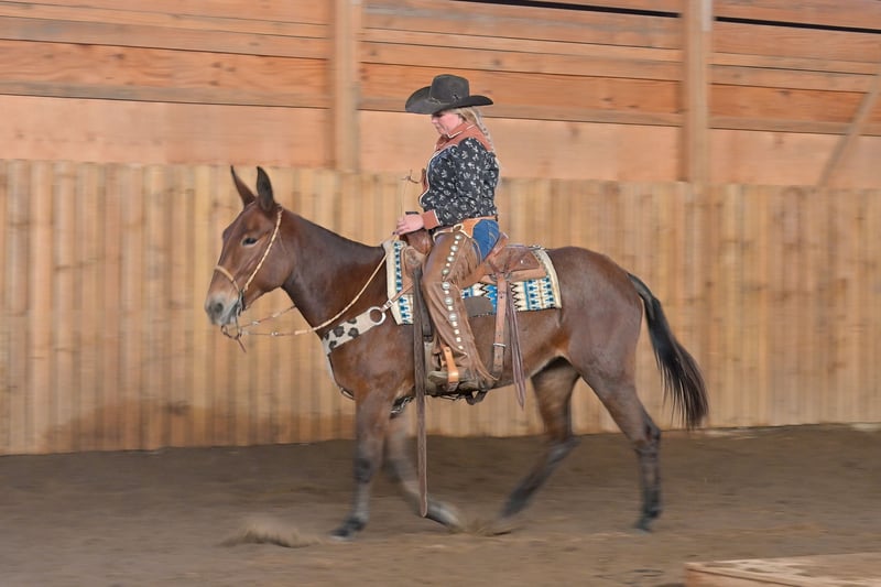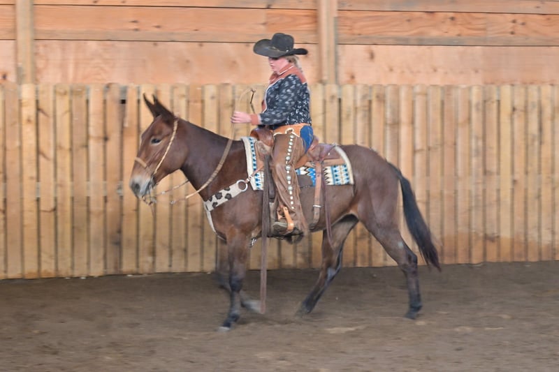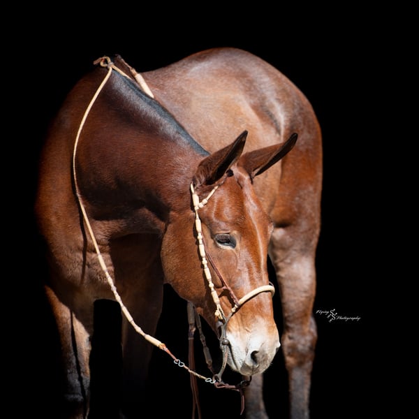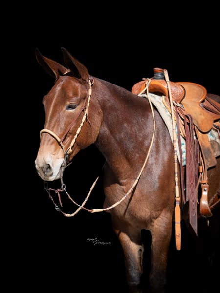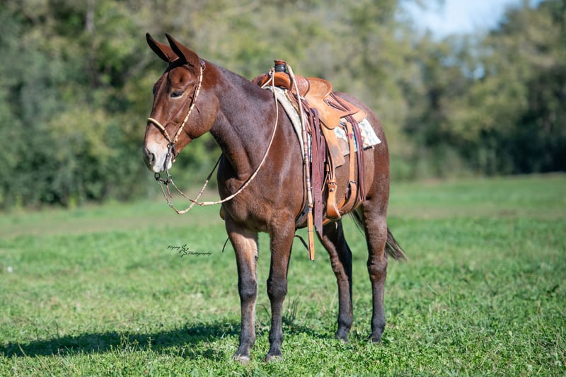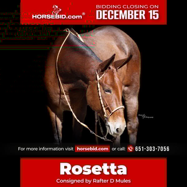 🎄𝐓𝐇𝐄 𝑯𝒐𝒍𝒊𝒅𝒂𝒚 𝐂𝐋𝐀𝐒𝐒𝐈𝐂🎄 Happening now thru MONDAY | DECEMBER 15th - Available EXCLUSIVELY on HorseBid's website! For more details and to register visit: www.Horsebid.com CONSIGNOR CONTACT: Rafter D Mules 651-303-7056 LOCATION: Hastings, MN BREED: Mule REGISTERED: No REGISTERED NAME: Rosetta COLOR: Bay Roan HEIGHT: 15.1 AGE: 11 GENDER: Molly Mule It is easy to say that Rosetta has become one of our favorite mules on the place! Although she captures your attention with her beauty, she keeps it with how well she rides and how incredible she performs. She earned a living for many years working at the OKC West sale, where she gained all the maturity and experience you could ask for! Rosetta is phenomenal to gather and sort cattle on. She has seen more cattle than most cowboys could even think of bragging about. I have personally roped and doctored many head with her, and she will not let you down. She will side pass to any gate and watch any cow. We have hauled her to South Dakota to ride trails, as well as gather and sort cattle on her. She is fantastic to ride and never slacks off on any job. She definitely enjoys trail riding the more than anything and covering open country. Rosetta truly takes care of her rider and has experience on many different terrains. She would be best suited for an intermediate to advanced rider, but a child that knows how to ride would get along great with her! She will stand at a mounting block or by a log on the trail to be mounted. Rosetta gracefully steps over logs and easily walks through water crossings. She is not bothered by mud, snow, or anything you could come ever come cross. We are so excited to offer her publicly! Rosetta is easy to catch, willingly picks up her feet with ease, stands quietly when being saddled, is not ear shy and is always easy to bridle. We have ridden her a lot of miles on the trails and are confident that she will be the apple of anyone's eye. You will absolutely love Rosetta and could honestly do any job with her. If you are looking for a mule to take out on the trails, ride through your cattle, or simply enjoy with your family...look no further. Rosetta checks every box that we could ask her to! If you have any questions or would like to meet Rosetta prior to the auction ending; contact Dillon at 651-303-7056. We look forward to pairing Rosetta with her forever family!