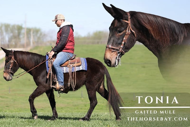 Has ears and will shift gears!!! This lady has all the gears a gaited mule lover could ever ask for! Tonia is one smooth mover! She has that hard-to-find long mane and tail, with a nice build. She stands around 14.3h, is 14 years old, and is a molly mule!!! We originally sold Tonia and several others to a long-time customer in California. This lady has trail ridden all of her horses and mules and always loaned them out for her friends to come over and ride. She has owned Tonia for almost 4 years. But at the age of 84 years old, she had an accident where she tripped over her dog leash and broke both knees and her wrist. Now, 6 months later, still with a long road to recovery ahead of her and barely being able to walk without assistance, getting back to caring for her herd of horses/mules and trail riding are far, far out of the question. She sent her crew back to us in January and requested that we find them another great home, as we intend to do!! Tonia was her first love, bringing her to love the long ears! Tonia has a super smooth 4-beat gait and is smooth at all speeds up to 12mph. She has been ridden around farm equipment, ATVs, over large noisy tarps, and has also had guns shot off of her back. She is not spooky acting, no matter where she goes or what she does. On the trails, she is always great! Tonia has been exposed to all kinds of wildlife, such as deer or turkey or other animals like cows or dogs, and will go anywhere that she is asked to. She has ridden many miles on the beaches of California and the mountains of Eastern Kentucky and encountered every obstacle possible on the trail. She will go up or down even the steepest slopes, across deep creeks, over downed trees, and all rough terrain while still being sure-footed. She has been ridden in traffic and is very safe around cars, semi, log, and dump trucks. She has a great personality and a great attitude about whatever she is asked to do.