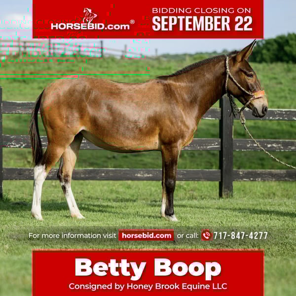 🍁𝒕𝒉𝒆 𝐅𝐀𝐋𝐋 𝑺𝒑𝒆𝒄𝒕𝒂𝒄𝒖𝒍𝒂𝒓🍁 Happening now thru MONDAY | SEPTEMBER 22nd - Available EXCLUSIVELY on HorseBid's website! For more details and to register visit: www.Horsebid.com CONSIGNOR CONTACT: Honey Brook Equine LLC 717-847-4277 LOCATION: Honey Brook, PA BREED: Mule REGISTERED: No COLOR: Bay HEIGHT: 13.2 AGE: 7 GENDER: Molly Mule ✨ WOW take a look at Betty Boop,a good lookin,well trained molly mule ✨ Betty Boop is one of the best trained mules you'll find that's for sale,she has a smooth 3 gaits that you'll never get tired of,a walk that is comfortable on the trail all day,a trot that you can easily sit for hours, and a lope that anyone can ride.. Betty Boop will move off of leg pressure easily,she will sidepass, yield front quarters and hind quarters separately if needed and also she is sensitive off of your seat and energy and can be ridden without a bridle and her responsiveness and speed won't change,she is fun and happy to work in the ring if that's your thing.. Betty Boop also is a willing mule if you like doing obstacles, whether it's a scary tarp or a teeter totter to cross it doesn't faze her ,she is good with carrying tarps and flags for you and also she will stand there while you throw your rope and drag your catch without a problem.. On the trail Betty Boop will take you through any creek or bridge you meet or over any mountain you need to climb,she is a super good trail mount and has lots of miles under her belt and also she is a proven pack mule that goes well in a string,she is a real workhorse and is happy to have a job.. Also Betty Boop will lay down on cue to make it easy to mount and dismount, be sure to watch the video,she is 100 percent sound, contact us for more information..we can help arrange shipping anywhere in the US