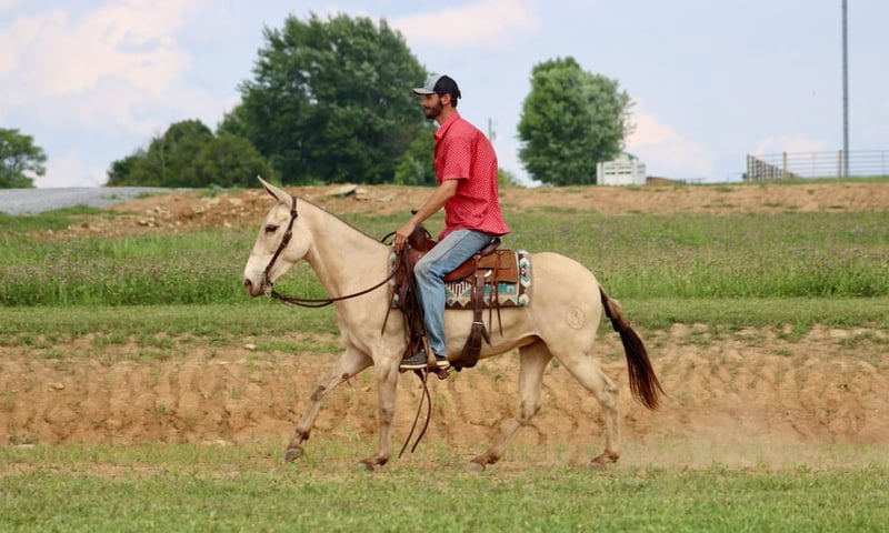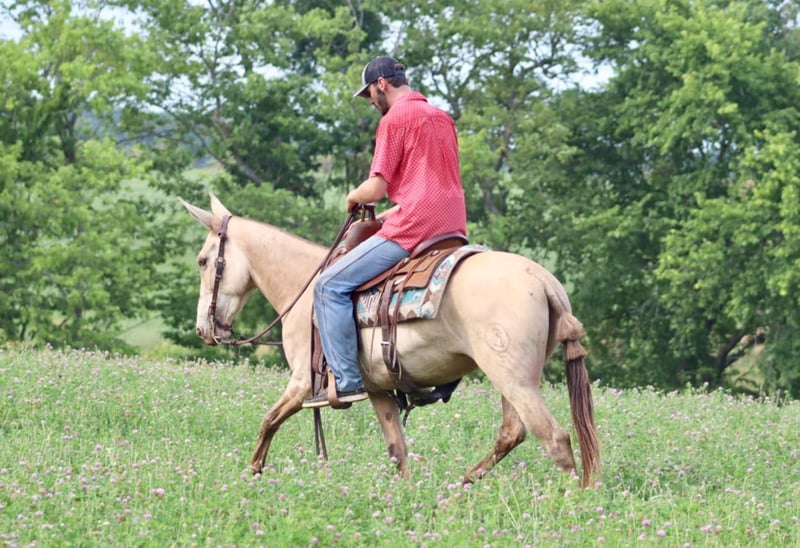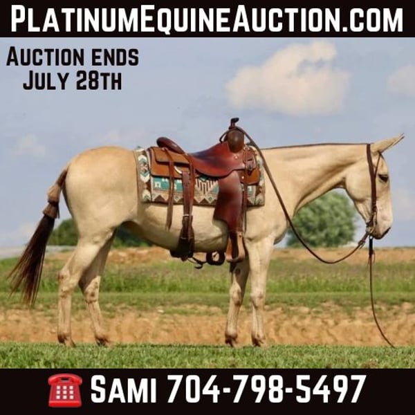 ONLINE AUCTION Place your bids at www.PlatinumEquineAuction.com Starting Bid $3500 Auction ends July 28th, 2024 Need a new saddle? Check out White Rock Saddles on our website or Facebook! My María is a stunning 6 year old, 14.2 hand ranch mule. Her eye catching champagne color and fun personality, makes her a joy to get on and ride everyday whether you are going on a relaxing trail ride, heading out for ranch work, or off to enjoy a fun show. María has been used in all aspects of ranch work. From roping and doctoring cattle, sorting pairs, to checking fence. She is comfortable around cattle and isn’t afraid of a hard day of work. She has spent a lot of time in west Texas and New Mexico, so seeing big country and some rough terrain is nothing new to her. If you’re looking to head out on a nice trail ride, she is game for that too. She will ride anywhere in the group, and will quietly ride away from her friends if asked. She also rides out alone confidently. María enjoys more difficult trails too. Point her nose up a steep bank and she will go, ask her to slide back down, she does it with ease. She walks over logs, goes through brush etc. She crosses water and doesn’t mind if it gets deep. María has also done extreme type trail obstacle such as swinging bridges, going up and down stacks of tires etc. María has a nice walk, jog, and lope. She neck reins, backs, and has a nice turn around. She rides nicely collected and has a beautiful lope on a full drape across the pasture field. You can open and close gates on her. She stands tied well and is quiet to tack up. She stands to mount and rides off nicely. María has been going to local fun shows this summer and handles that commotion nicely as well. She is traffic safe and has been ridden around farm equipment that is working. María is a super nice, all around mule that is super fun to ride. Don’t miss out on a great one! For more information, contact Sammi Waugh 704-798-5497 Located in Brooksville, KY. ONLINE AUCTION Place your bids at www.PlatinumEquineAuction.com Starting Bid $3500 Auction ends July 28th, 2024 Need a new saddle? Check out White Rock Saddles on our website or Facebook!