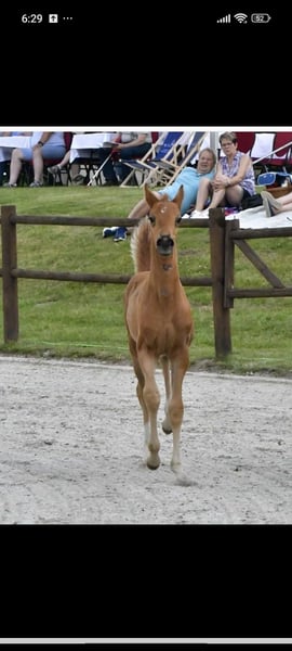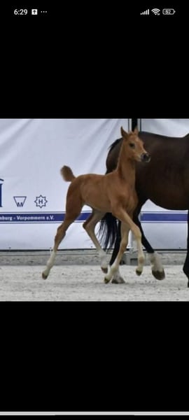 Hübsches Stutfohlen von Pjethro (Kjento -Desperado) Sie ist in Juni geboren hat 3 tolle Grundgangarten. Ihre Mutter ist eine Staatsprämienstute von Sandro Hit/Lanthan,sie brachte schon sehr gute Fohlen sie wurden zu Blue Horse sowie an Schokemöhle verkauft . Eine Tochter von Joviam würde hochpreisig in die USA verkauft Mit ihren Charakter weiß sie zu gefallen immer anhänglich. Sie kennt das Fohlen Abc , regelmäßig entwurmt . Auf der Fohlenschau erhielt sie die Eliteprämie . Später ein tolles Pferd für den Dressursport Kann zur Aufzucht auch noch stehen bleiben