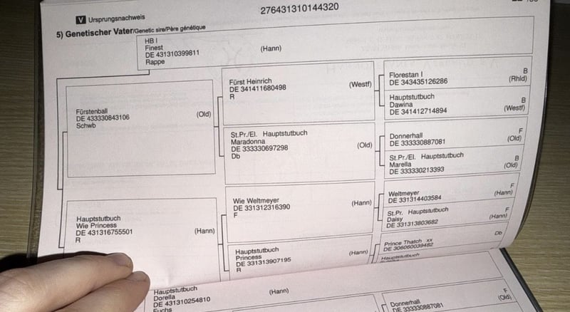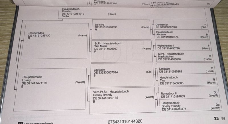 Se ofrece una yegua de cría de 5 años, aproximadamente 1,70 m de altura, inscrita en el Studbook I. Es hija de Desperados y Finest. En abril de 2025, dio a luz a una potra sana. Durante este período, se mostró muy fácil de manejar; separar a la yegua de su potranca siempre fue sin problemas. La yegua se carga en remolque/transporte, conoce la pista de manejo, asiste regularmente al herrador, le han realizado limpieza de dientes, y está vacunada contra herpes, influenza y tétanos. Tiene inscripción para competición en doma clásica. Sale a pasear, trota, y acompaña en bicicleta. Sin enfermedades. Para interesados serios, se pueden enviar más detalles o videos por mensaje.