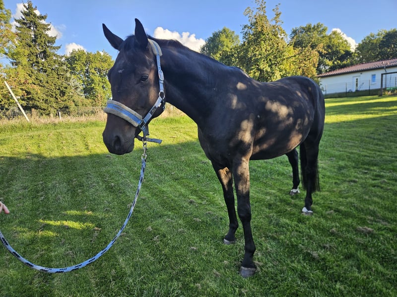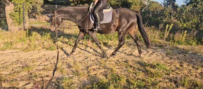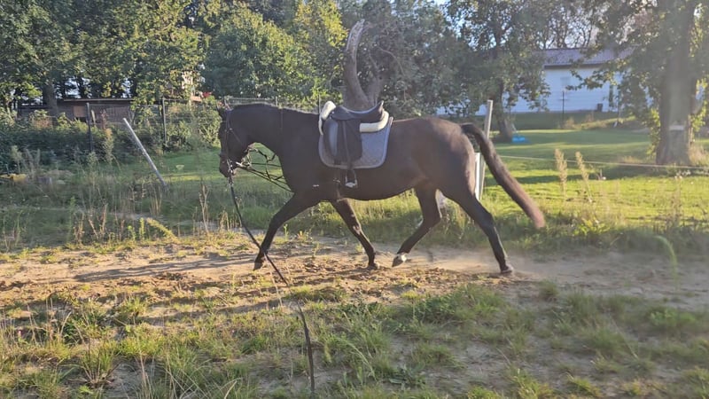Je propose ici à la vente un hongre Mecklenburger né en 2020. Il est issu de Landstreicher x K2, de couleur noir-brun et avec un caractère intrépide. Depuis son sevrage, il grandit chez nous dans un environnement familial au sein d'un troupeau de hongres. Il est très attaché aux humains et est habitué aux enfants (jouer avec un ballon, sauter sur un trampoline sur le terrain de saut, bruits forts, etc.) ainsi qu'aux situations quotidiennes normales. Il est également très bien manipulé par le maréchal-ferrant, et il est prêt à être couvert en hiver, etc. Par manque de temps, il a malheureusement été seulement longé jusqu'à présent. Cependant, il connaît la selle et le poids du cavalier. À la longe, il se déplace très sereinement dans les trois allures, ainsi que sur des barres de trot et de galop, et il connaît également le saut en liberté. Si vous recherchez un jeune cheval intrépide et peu utilisé pour une formation ultérieure, n'hésitez pas à me contacter par WhatsApp (0172/6437767).