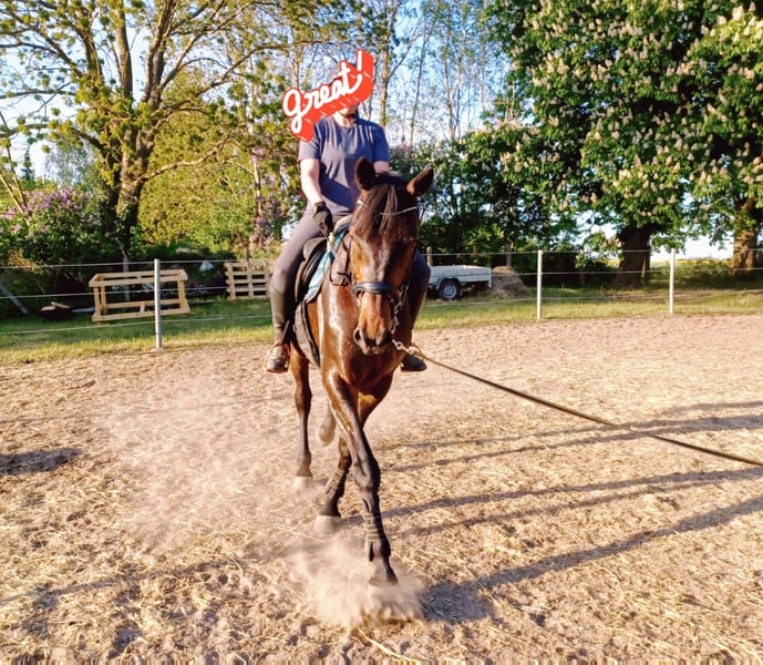 Ciao, con grande tristezza stiamo cercando un nuovo cavaliere per il nostro cavallo Mecklenburger di 6 anni, "Luzian Renard". Purtroppo non possiamo tenere tutti i cavalli, quindi "Luzian Renard" è in vendita. È stato mandato in addestramento a 4 anni, ma a causa della mancanza di tempo, non è stato ulteriormente sviluppato. Circa 4 mesi fa abbiamo ricominciato a lavorare con lui, facendo lavoro in longe e a terra, ma dobbiamo ammettere che purtroppo non riusciamo a gestirlo temporalmente. È davvero un peccato lasciarlo fermo. Lo vendiamo come più o meno grezzo, quindi purtroppo non è possibile provarlo. Cerchiamo una nuova casa in cui possa essere ulteriormente sviluppato e stimolato. Luzian conosce sia il box che la gestione in paddock. In estate sta all'aperto 24 ore su 24, 7 giorni su 7. Tende a tossire se rimane in box per un lungo periodo, quindi non raccomandiamo una gestione esclusivamente in box. Luzian è un ragazzo affettuoso e coccolone che desidera sempre piacere. Con un'altezza di 1,74 m, ha un aspetto imponente e può facilmente ospitare anche cavalieri di grandi dimensioni. Ha tre andature di base straordinarie. Conosce il maniscalco e non ha comportamenti problematici come scalciare, mordere o colpire. Grazie alla sua discendenza, è anche interessante per il salto ostacoli o il completo. Suo padre è Lezard 7, che discende da Cor de la Bryère / Landadel / Landgraf. Se Luzian ha suscitato il vostro interesse, non esitate a contattarci.