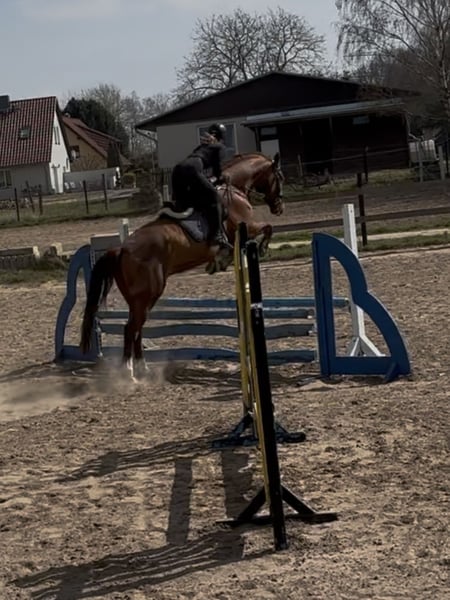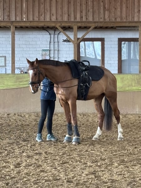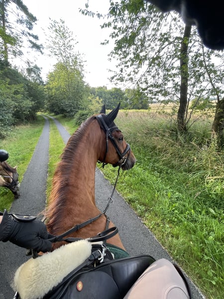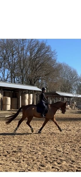 Aus Zeitmangel aufgrund meines Studiums steht mein 7 jähriger Wallach „Benno“ zum Verkauf. Er ist ca. 1,75m und deckt somit auch größere Reiter/innen sehr gut ab. Er befindet sich auf einem soliden A-Niveau in der Dressurarbeit. Im Parcours zeigt er sich auch stets motiviert und das regelmäßige Freispringen bereitet ihm viel Freude. Er zeigt dort Übersicht und ist stets ehrlich am Sprung. Auch, wenn der Fokus in unserer täglichen Arbeit nicht auf dem Springen liegt, wird Benno trotzdem regelmäßig mit Stangen gearbeitet. Er geht brav in der Gruppe ins Gelände und ist natürlich absolut Schmiede- und verladefromm. Lies sich bislang von alt bis jung reiten. Auch unter Reitanfängerinnen zeigte er sich sehr gelassen und brav. Ein wenig Turnierluft konnte er bereits schnuppern und verhielt sich dort jungpferdgerecht. Auch an einigen Lehrgängen auswärts hat er bereits teilgenommen. Benno ist ein richtiger Kumpeltyp und liebt es lange verwöhnt und umsorgt zu werden. Dem Menschen gegenüber ist er nie böse. Ich würde ihn als artiges Pferd bezeichnen, der mit seinem jungen Alter ab und zu nochmal etwas grün hinter den Ohren ist, aber stets händelbar bleibt und viel Quatsch mitmacht. Volti würde bisher einmal angetestet (siehe Fotos) dort zeigte er sich sehr brav und aufgeschlossen. Die Zähne wurden im Februar 2026 nochmal gemacht. Eine AKU aus 10/2023 liegt vor, eine aktuelle kann auf Wunsch und gegen Kostenübernahme gemacht werden. Wir freuen uns auf eure Nachrichten und beantworten gerne offene Fragen