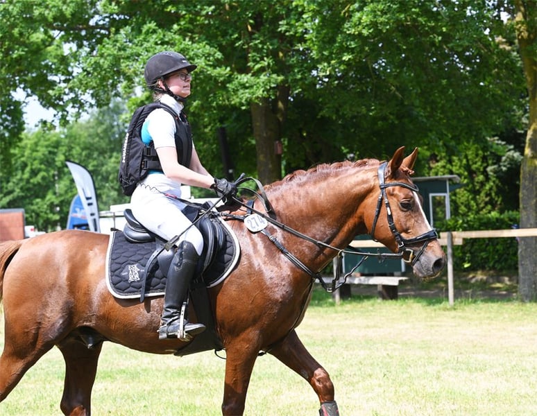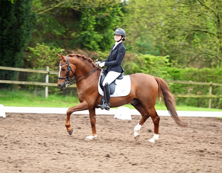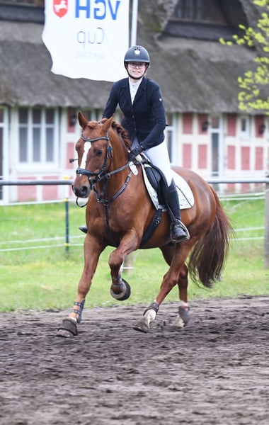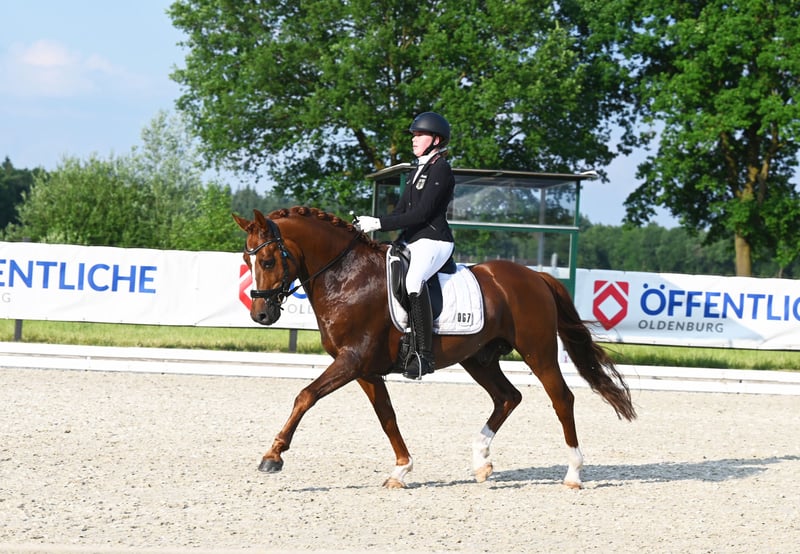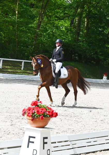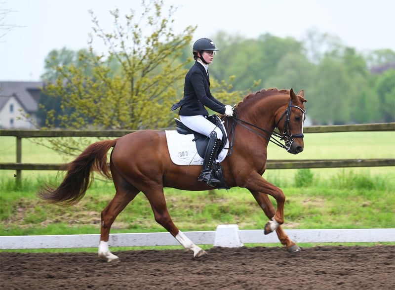 Dieser wunderschöne Hengst besticht durch sein ausgeglichenes Temperament, seine lockeren Bewegungen und einen raumgreifenden Schritt, der regelmäßig mit 9er Noten bewertet wird.