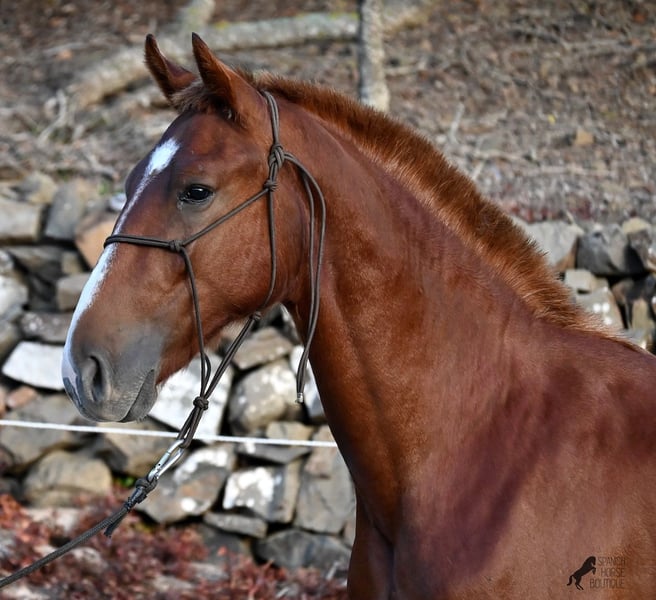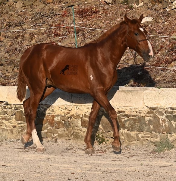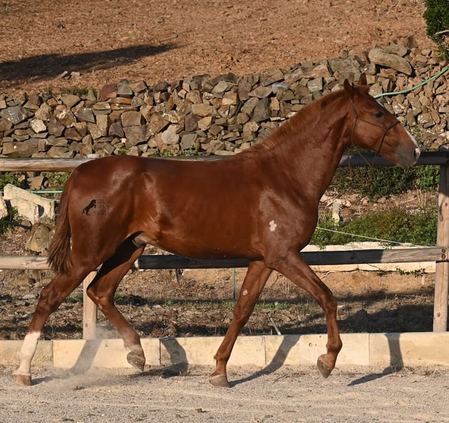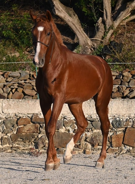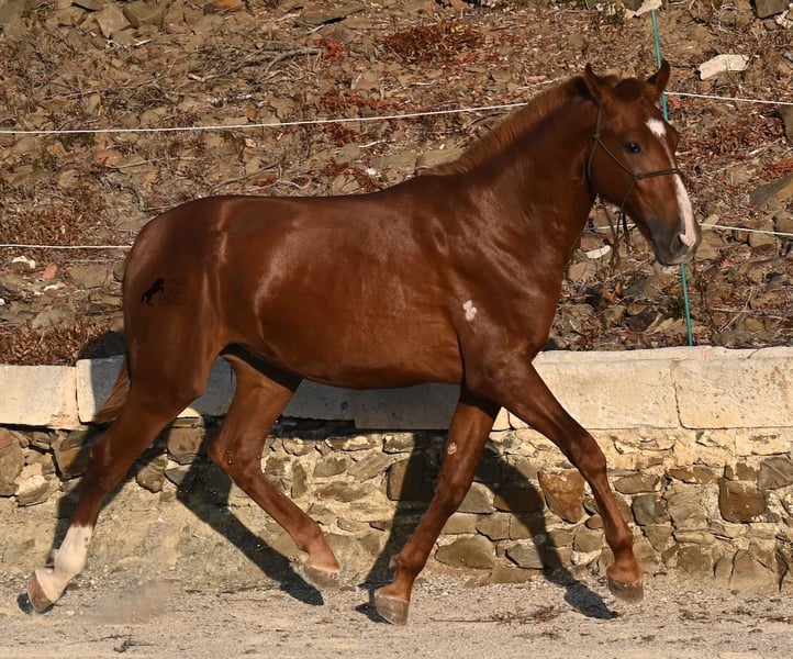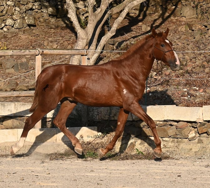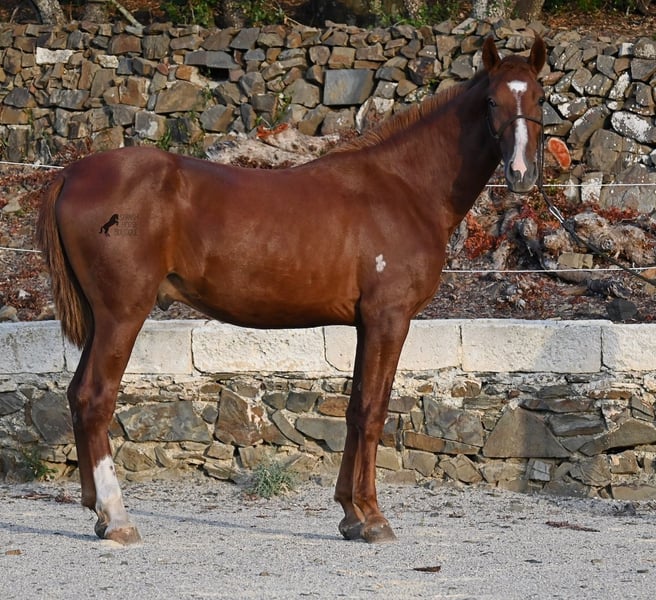 A Menorquin is already a very exclusive horse, as they are endangered. It is very rare for Menorquins to be born in chestnut color, which are considered lucky charms. However, this 2024-born Menorquin stallion is even more extraordinary and unique, as he also has a blaze, one white sock, and a white mark on his right shoulder. So if you are looking for an unmistakable horse that is unmatched in uniqueness, then this chestnut jewel is the end of your search :) The young horse descends from old and original lines of the Menorquin, known for their resilience and endurance. He has the typical movements desired locally for the fiestas. Not very expansive but sofa-comfortable in all gaits! In handling, he is very well-behaved, though still a bit shy, as the horses from this breeder grow up in a robust environment on many hectares of land. He would surely appreciate a forever home where he can learn even more and have contact with people. Not long ago, the breeding association decided that the "red" Menorquins would also be recognized by the association, provided they are purebred. Thus, the young horse also has the original Menorquin papers and his entry in the studbook, but only black specimens are allowed for breeding. His expected final height is around 164 cm. Videos and pedigree available upon request! His location is Menorca. I would be happy to organize a foal inspection, transport, or your trip should you wish to come and see him in person. Details can be found on my page or in conversation. Greetings from Spain!
