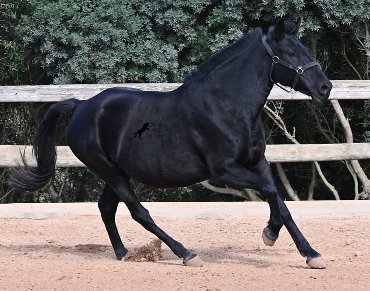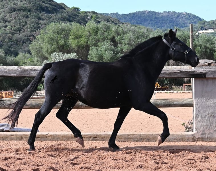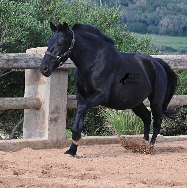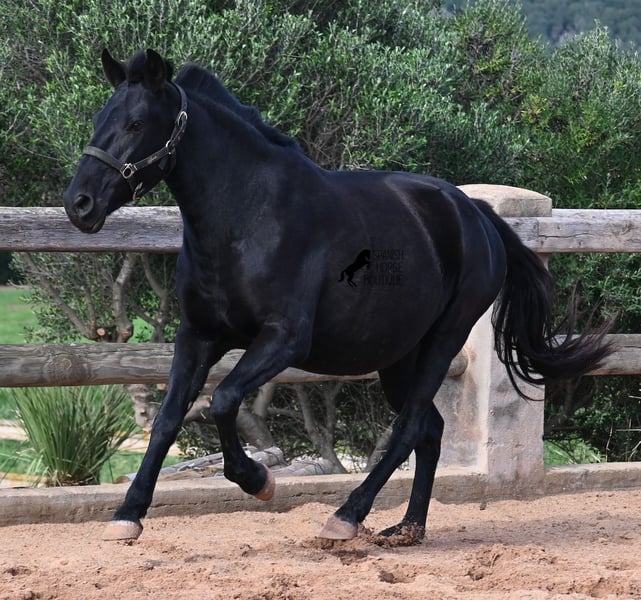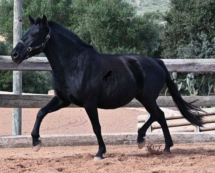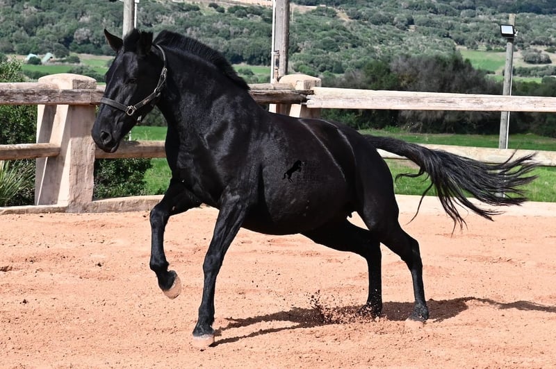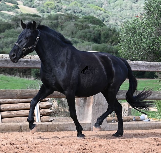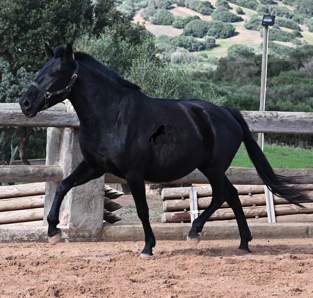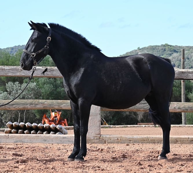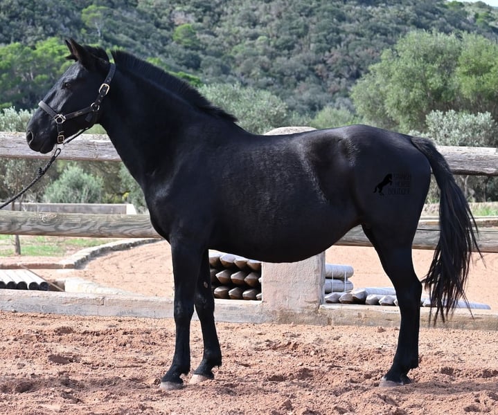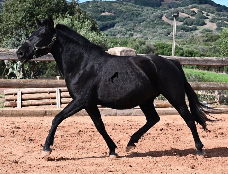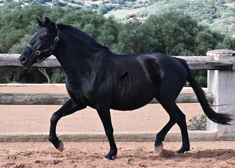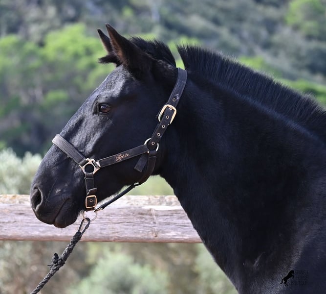 This 2016-born purebred Menorquín mare carries a purebred Menorquín foal in her belly. :) She is a breeding mare and has not been ridden. She was covered in March 2025, so travel for her and the foal is not an issue, and there is ample time for her to acclimate to her new environment before the foaling date. Apart from a white marking on one hind leg, she is completely black. You can see in her movement that she is carrying some extra weight, but otherwise she moves very correctly. She is kept in a 24/7 paddock system on many hectares of land, making her very resilient. Her qualities as a mother have already been proven, and she comes from very primitive lines of the Menorquín, known for endurance and versatility. Videos and pedigree available upon request. Her height at the withers is 156 cm, and she is barefoot. Location: Menorca. I am happy to arrange a pre-purchase veterinary examination, transportation, or her journey if you wish to view her in person. Details can be discussed on my website or in a conversation. Greetings from Spain