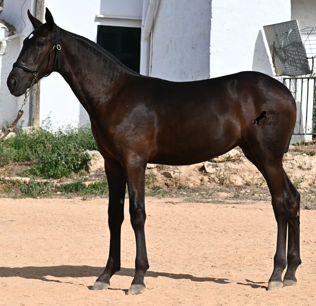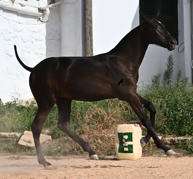 Esta yegua menorquina pura raza, nacida en primavera de 2025, ya es muy elegante y femenina. Su delicada cabeza con una mirada suave se adapta bien a su exterior grácil, y sus ojos brillan como su estrella en la frente. Ya ha sido destetada con éxito y es manejable con cabezada, después de haber estado en grandes praderas, en un grupo con yeguas de todas las edades. Hay muchas subidas y bajadas en terrenos rocosos y muy duros, donde siempre están afuera, sin importar el clima. Esto no solo la ha hecho muy social y robusta, sino que también ha contribuido a su crecimiento saludable, lo cual se puede ver en sus patas claras y buenos cascos. Ahora vive en un "jardín de caballos", donde puede jugar y prosperar, como se desea en la crianza, para convertirse en un caballo sano y social. Por parte paterna, tiene varios campeones de raza como hermanos, y por parte materna proviene de las originales "líneas de fiesta" del menorquín. Es muy ágil, tiene un fuerte trasero y una espalda igualmente fuerte. Más adelante será interesante para muchas disciplinas, seguramente también para la Equitación de Trabajo gracias a su agilidad. Es muy abierta hacia las personas y busca el contacto. Se espera que su altura final sea de alrededor de 160 cm. Videos y pedigree disponibles a solicitud. Su ubicación es Menorca. Con gusto organizaré una revisión veterinaria de potros, transporte o su viaje, en caso de que desee venir a verla personalmente. Para más detalles, no dude en visitar mi página o en conversar. Saludos desde España.