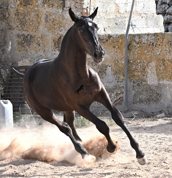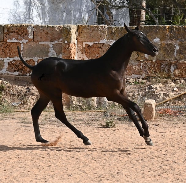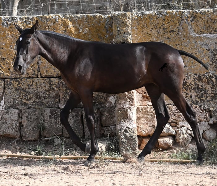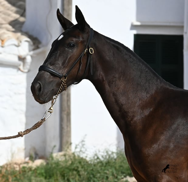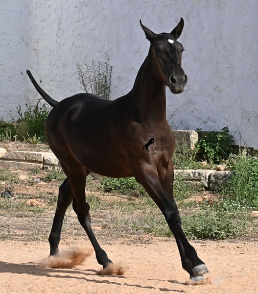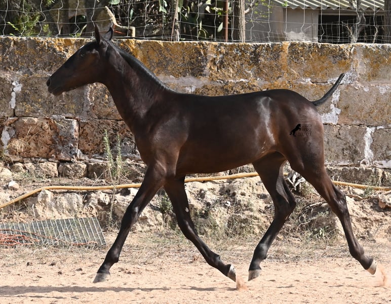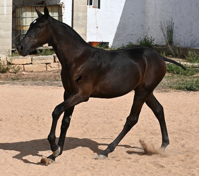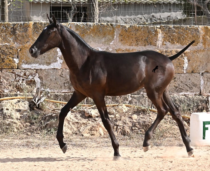 This purebred Menorquin mare, born in spring 2025, already exudes elegance and femininity. Her delicate head with a gentle expression suits her graceful conformation perfectly, and her eyes shine as brightly as the star on her forehead. She has been successfully weaned and halter-trained after spending time on extensive pasture land within a herd of mares of all ages. The terrain is hilly and rocky, with very hard ground, where she has been outdoors in all weather conditions. This has not only made her highly social and resilient but also contributed to healthy growth, as evidenced by her clean legs and good hooves. She now lives in a foal kindergarten, where she is free to play and thrive, as one would wish during upbringing, to develop into a healthy and social horse. On her paternal side, she has several Rassechampions among her siblings, and maternally, she descends from the original "Fiesta lines" of the Menorquin. She is very agile, with a strong hindquarters and a robust back. Later, she will be suitable for many disciplines, especially for Working Equitation, thanks to her agility. She is very approachable and seeks contact with humans. Her expected final height will be around 160 cm. Videos and pedigree available upon request. Her current location is Menorca. I am happy to arrange on-site foal health checks, transport, or her journey if you wish to visit personally. Further details can be discussed on my website or in conversation. Greetings from Spain