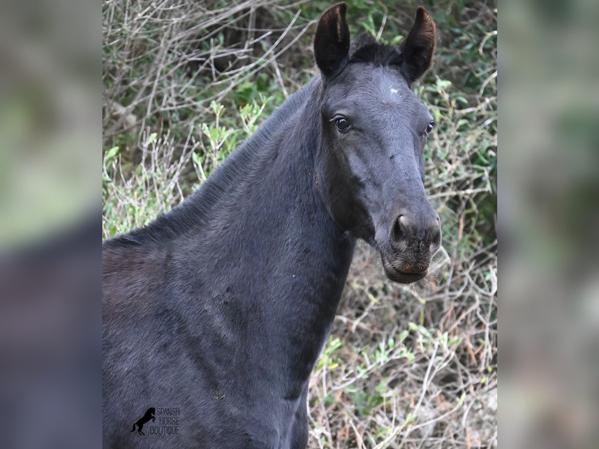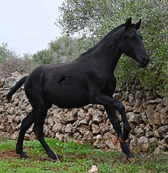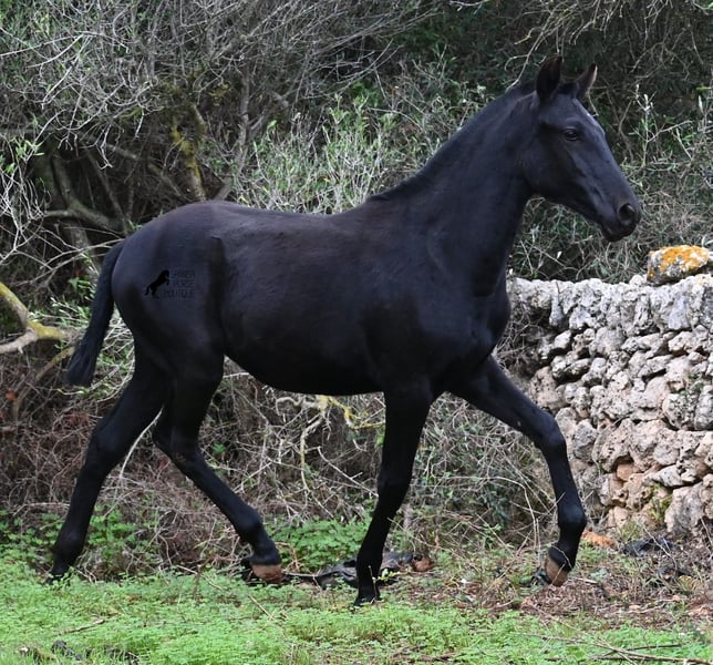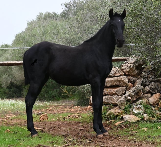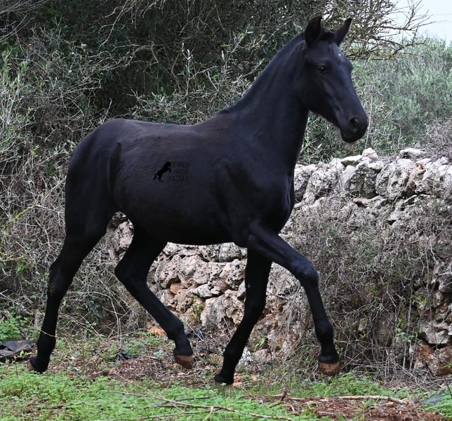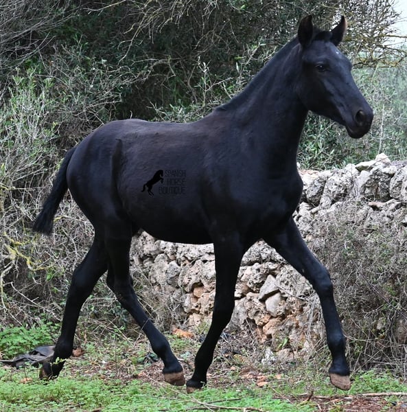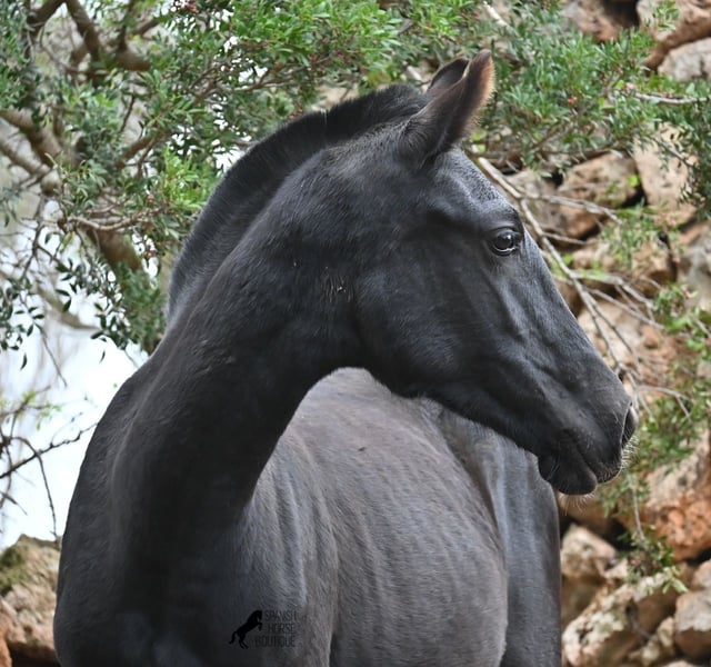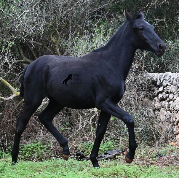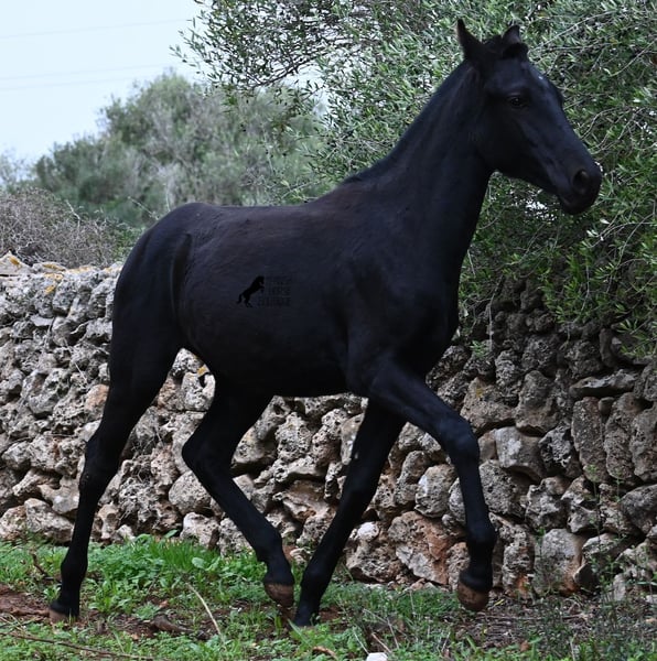 Born in February 2025, this purebred Menorquin mare is already a charming little baroque beauty :) Apart from a tiny star on her forehead, she is completely black like her mother. Her mother is over 1.70 meters tall and is the daughter of a RECOMENDADO stallion, renowned for his outstanding dressage performance. The young lady’s sire has been multiple times the top stallion of his breed and carries lines from old Menorquin bloodlines. She is kept outdoors 24 hours a day in all weather conditions, including rain, which made the footing a bit slippery during the photoshoot. She is familiar with her stable, as well as electric fencing—something not always common in Menorca, where walls often serve as boundaries instead. She is very friendly, approaches the herd confidently, and has a gentle, horse-friendly disposition. She has learned to trust humans as friends, allowing herself to be tied up, haltered, have her hooves picked out, bathed, loaded, and she has even been lunged in walk and trot on a stall halter. She is regularly dewormed and knows both lush grass and hay, as well as concentrated feed. Even in winter, transitioning to a new home is no problem; on Menorca, it can get chilly, and she already sports a beautiful, dense, plush winter coat. If you wish to acquire her later, a suitable foster place can be arranged. Videos and pedigree details are available upon request. Her current location is Menorca. I am happy to organize a foal health check, transport, or her journey if you wish to visit her in person. More details are available on my website or in a personal conversation. Greetings from Spain