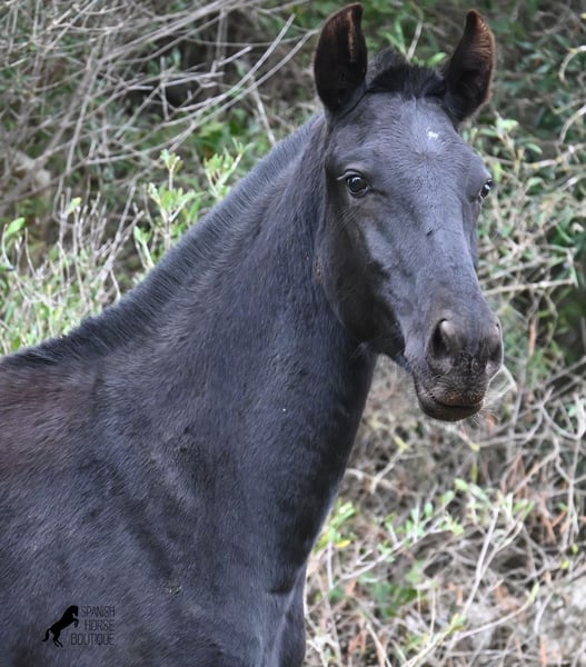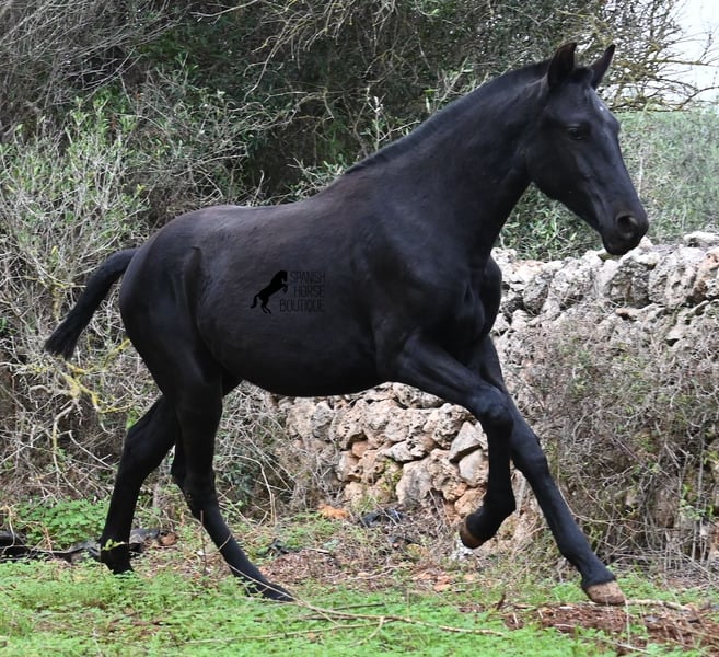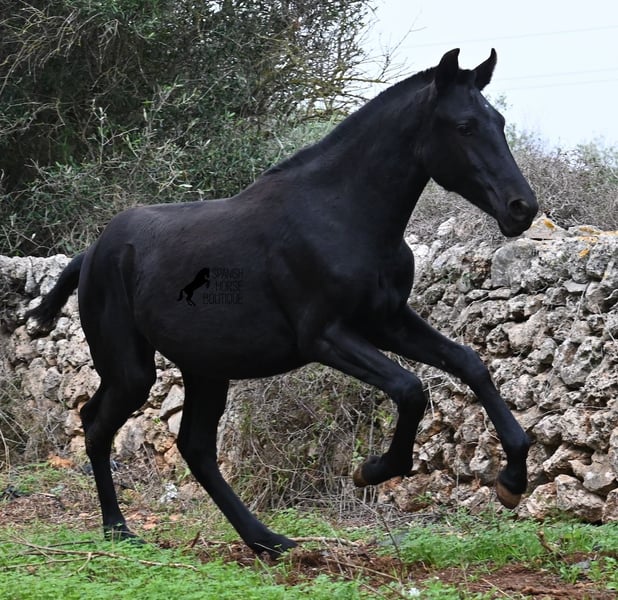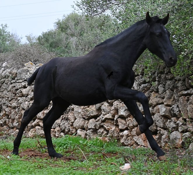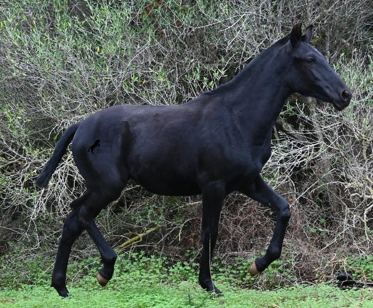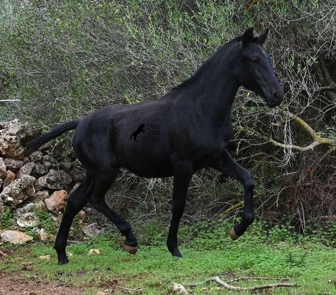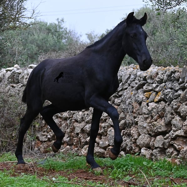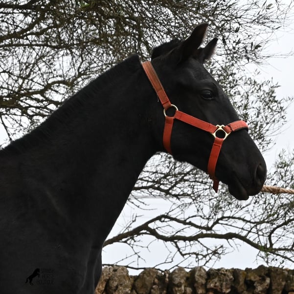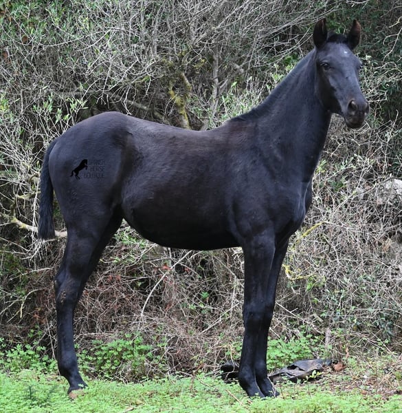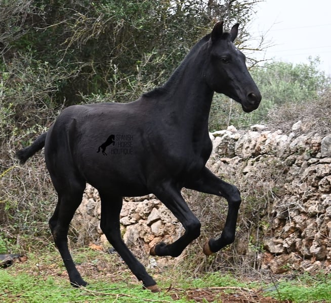 Born in February 2025, this purebred Menorquin mare is already a charming little baroque beauty :) Apart from a tiny star on her forehead, she is completely black like her mother. Her mother is over 1.70 meters tall and is the daughter of a RECOMENDADO stallion, renowned for his outstanding dressage performance. The young lady’s sire has been multiple times the top stallion of his breed and carries lines from old Menorquin bloodlines. She is kept outdoors 24 hours a day in all weather conditions, including rain, which made the footing a bit slippery during the photoshoot. She is familiar with her stable, as well as electric fencing—something not always common in Menorca, where walls often serve as boundaries instead. She is very friendly, approaches the herd confidently, and has a gentle, horse-friendly disposition. She has learned to trust humans as friends, allowing herself to be tied up, haltered, have her hooves picked out, bathed, loaded, and she has even been lunged in walk and trot on a stall halter. She is regularly dewormed and knows both lush grass and hay, as well as concentrated feed. Even in winter, transitioning to a new home is no problem; on Menorca, it can get chilly, and she already sports a beautiful, dense, plush winter coat. If you wish to acquire her later, a suitable foster place can be arranged. Videos and pedigree details are available upon request. Her current location is Menorca. I am happy to organize a foal health check, transport, or her journey if you wish to visit her in person. More details are available on my website or in a personal conversation. Greetings from Spain