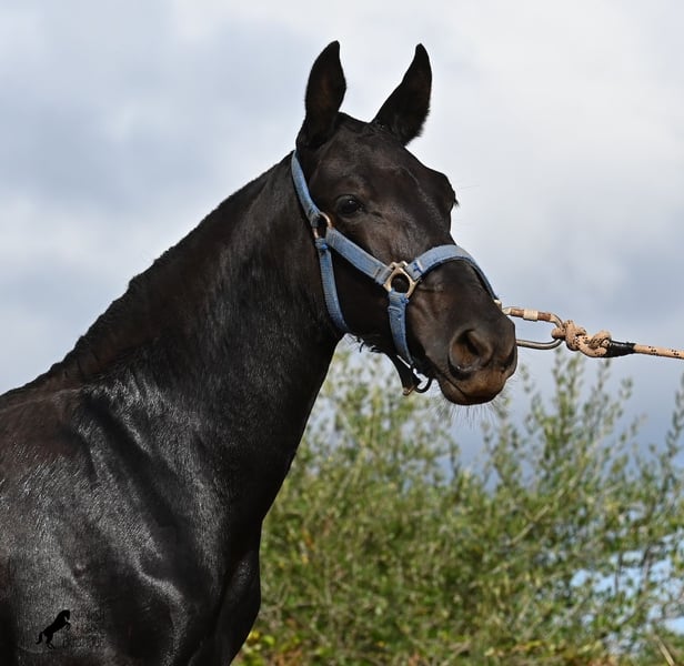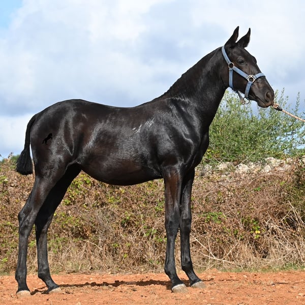 This purebred filly, born in spring 2025, is a truly elegant young lady! She comes from very old lines of the Menorquín, known for producing hardy horses, and she is beautifully jet black. With a blend of strength and grace, she demonstrates excellent movement, and proudly carries her tail high (traditionally docked like her mane). She moves gracefully even over rocky terrain, much like a ballet dancer. As is highly desirable in the breed, she has no white markings, and her dam is now even listed in the breed's improvement catalog. She is already quite tall, with her mother measuring over 16.1 hh. She was born in robust condition, is currently being weaned and is very calm and confident. She is familiar with dogs, children, and basic foal handling, and with her sweet temperament, she will learn quickly as she grows. Her expected final height is around 16.1 hh (or more!). Videos and pedigree available upon request. Her location is Menorca. I am happy to arrange a foal health check, transportation, or even her journey if you wish to visit her in person. Details can be discussed on my website or in a personal conversation. Greetings from Spain