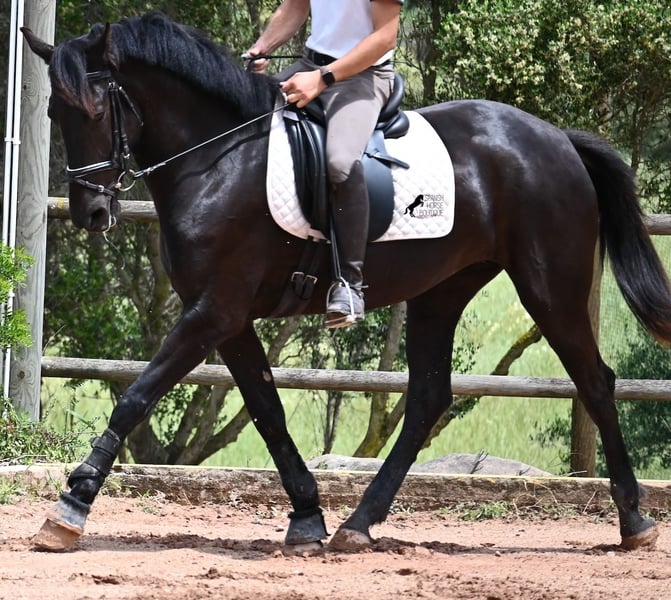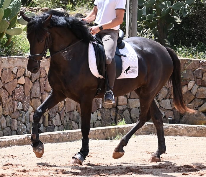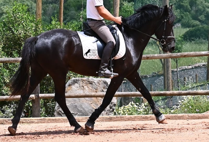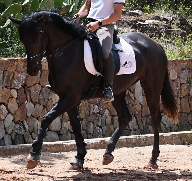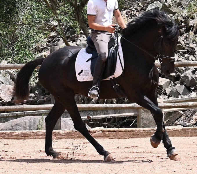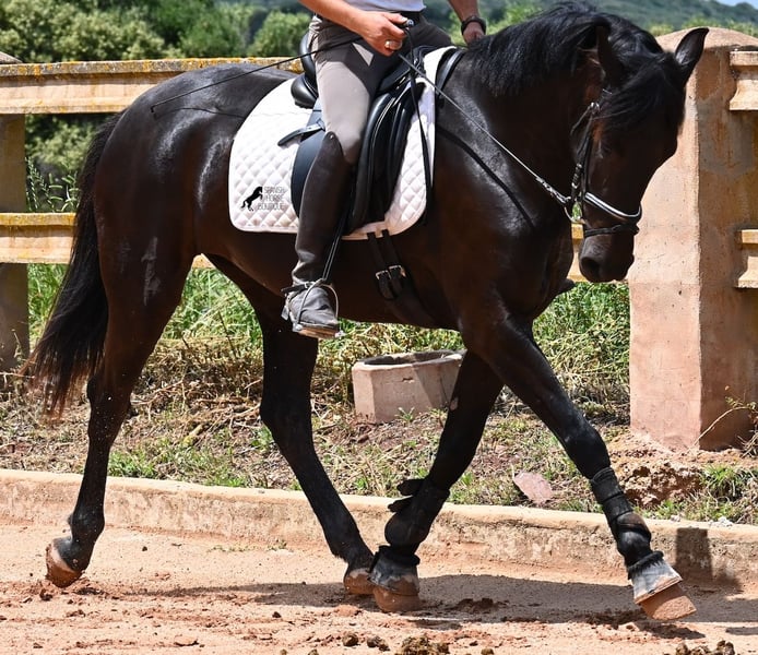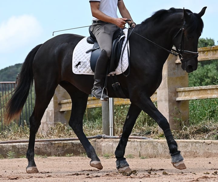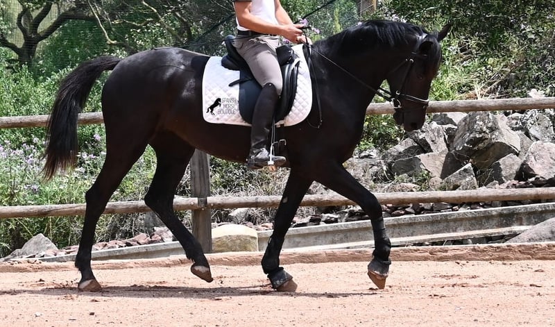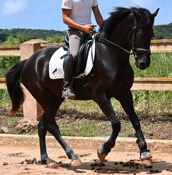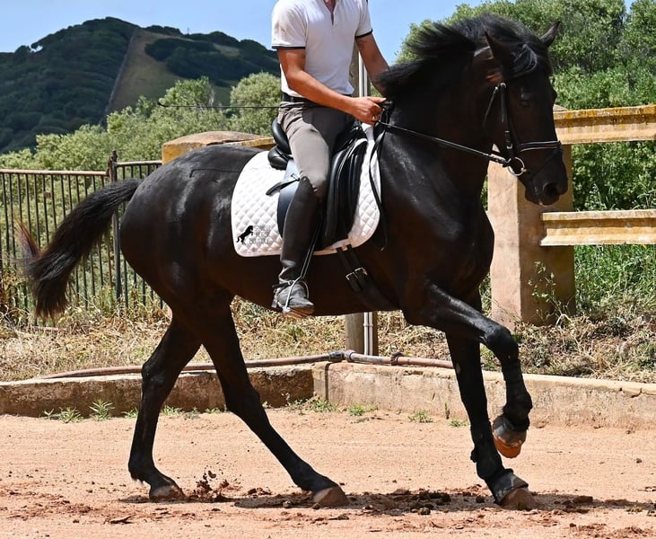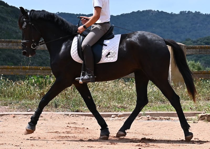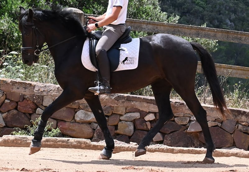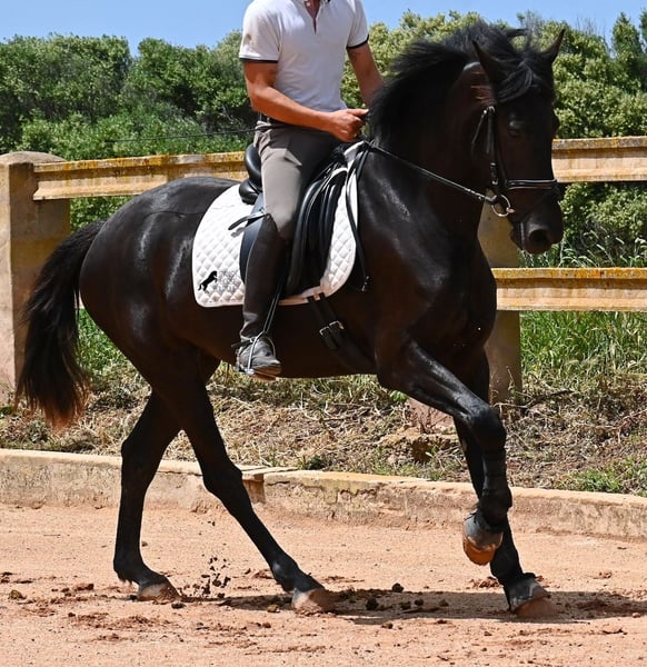 This 2021-born, purebred Menorquin mare is not only quite tall for her age at 165 cm, but she also has a correspondingly big heart! She is a completely charming, affectionate mare, typically Menorquin in her deep relaxation, and couldn't be more pleasant. In handling, she is a sweetheart and under saddle, she always wants to please her rider. Since she is quite large, she has been given a bit more time to grow, so she was only introduced to the rider in winter 2024 and is now being gently further trained. She is eager and absolutely well-behaved, as if she has been a riding horse for years. Her training level corresponds to that of a young horse, so sometimes she still follows her nose a bit, but she is increasingly accepting contact and learning to carry herself better. She goes barefoot without any issues, has grown up in a robust herd environment, and has been stabled since the beginning of her training. She is approved for breeding but has not yet produced any offspring; however, anyone interested in breeding a foal from her has that option available. Even though very old lines of the Menorquin flow through her veins, where the horses were not as large and were rather baroque, she is very athletic and will still grow a few more centimeters! There is the option for training in English style or Horsemanship on-site! Currently, she is located in Menorca! Videos and pedigree available upon request. I would be happy to arrange a vet check, training, transport, or even your trip if you wish to come see her in person. Details can be found on my page or in conversation. Greetings from Spain!