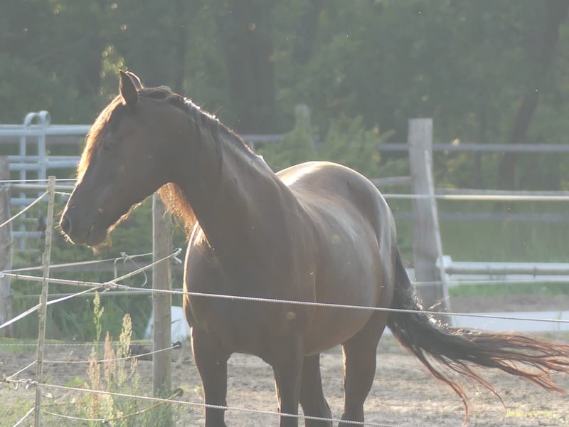 Leonards Lillifee Go – a stunning Missouri Fox Trotter mare, born in 2009, standing approximately 14.8 hands high, with a beautiful black coat. She is compact, correctly conformed, and healthy. She bears a small, old, fully healed scar on her right hock, which is purely cosmetic and does not affect her in any way. Lillifee loads easily, is familiar with the vet and farrier, regularly vaccinated and dewormed, and currently lives in an open stable. She is very dominant within her herd. She has an exceptionally sweet, people-oriented character, is open-minded, affectionate, gentle in handling, and very cuddly. Despite her good nature, she is not suitable for absolute beginners, as she has only been ridden irregularly due to lack of time. She is on a good path, eager to learn, and can be further developed with consistent, calm training. She is confident and relaxed around children, dogs, and in traffic. She knows groundwork and is ridden recreationally. In the terrain, Lillifee is motivated and reliable, especially when accompanied, she moves out briskly. Under saddle, she is less enthusiastic on the arena but demonstrates beautiful, rhythmical movements in all four gaits, typical for her breed, and very comfortable to sit. Thanks to her excellent pedigree, Lillifee is also interesting for breeding, although she has not yet had a foal. With a heavy heart, she is being offered due to lack of time to a loving and nurturing home. She is a loyal partner for someone seeking a gentle, people-oriented mare with character, presence, and potential.