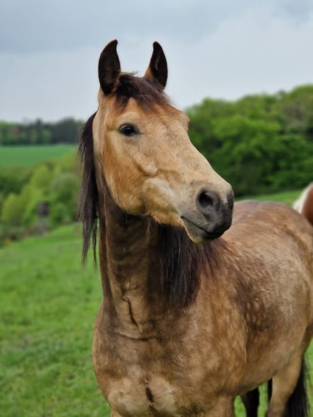 White Clouds Cisco Né le 12.06.2020 Missouri Foxtrotter avec papiers Buckskin avec un éclat bronze, Sunny Boy de l'optique et de la conformation parfaites, un rêve pour toutes les disciplines, un véritable costaud, sûr de ses pas, apte au terrain, aime être mené, mais se déplace dans toutes les positions, endurant, courageux, indépendant, robuste, stable, court de dos, volontaire, mais un peu paresseux sur le manège, orienté vers les humains, beau galop, se tient en premier à la clôture, curieux, joueur, drôle, audacieux, diligent, en bonne santé, apprend vite, professionnel en travail au sol, réactif et rapide. Formation de base avec l'entraîneur Horsemen Michael Rieser. Novembre/Décembre 2024 avec l'entraîneur de chevaux de gang Vierhaus (@ photos d'Ellen Vierhaus) Pour poursuivre la formation et le développement du Flatfoot Walk. Très équilibré dans un terrain difficile. Je l'ai acheté comme poulain, car il promettait de devenir comme son père un rassembleur naturel et a hérité de son excellent tempérament sûr de lui. C'est pourquoi j'ai acheté son demi-frère, qui sera beaucoup plus grand. CISCO a maintenant besoin d'un cavalier expérimenté, quelqu'un qui peut parfois s'imposer calmement et avec détermination, car il est encore au début de sa formation et n'a pas encore beaucoup travaillé, totalement non utilisé. Habitué à être en pâturage toute l'année avec un abri ouvert, groupe mixte, de rang élevé. Il a déjà participé à sa première petite randonnée et l'a maîtrisée avec brio, seul les dindons lui ont fait peur, mais il a ensuite suivi sans problème les grands Tennessee Walkers. Très bons sabots solides, jusqu'à présent en mode naturel. En bonne santé et plein d'énergie, naturellement vermifugé et vacciné.