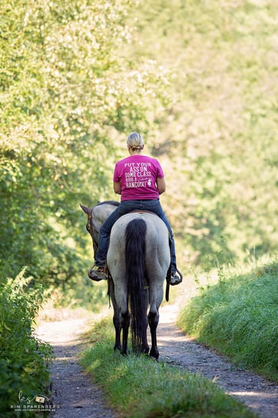 VOUS AIN'T RIDING UNTIL YOU'RE RIDING A HANCOCK .... c'est un secret de polichinelle chez les éleveurs américains. Aux États-Unis, ils sont élevés pour le «travail de ranch tous les jours» et pour des compétitions comme l'équipe Roping et Ranch Versatility. En Europe ligne de sang extrêmement rare, qui signifie endurance, robustesse, force nerveuse, os extrêmement forts et sabots durs. Notre MJM Saltys Blue Ezra est un digne représentant de cette lignée. Nous l'avons importé des États-Unis pour rendre ces caractéristiques originales d'un quart disponibles à nouveau dans les pays germanophones. Comme le montre la progéniture précédente, il est également parfaitement adapté pour renforcer les fondations et les nerfs des quarts-stuts de performance-dessinés ;-) . Sa taille de stock est de 156 cm, il est homozygote pour le noir et pour Roan. Bien sûr, il s'agit de Five Panel n/n, ainsi que DE MYH1 n/n. Couvert de graines fraîches, réfrigérées et congelées. Taxe de couverture : 950,00 euros et 100 euros de frais supplémentaires de la station de pont par commande de semences, environ 35 euros d'expédition (le prix d'expédition n'est valable que pour les semences réfrigérées!). Plus d'informations sur notre site ou sur FB sous son nom.
